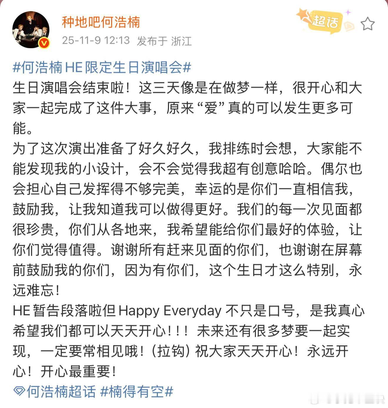 何浩楠生日限定的三天 何浩楠生日限定的这三天,是粉丝与偶像的甜蜜相伴!三天演唱会