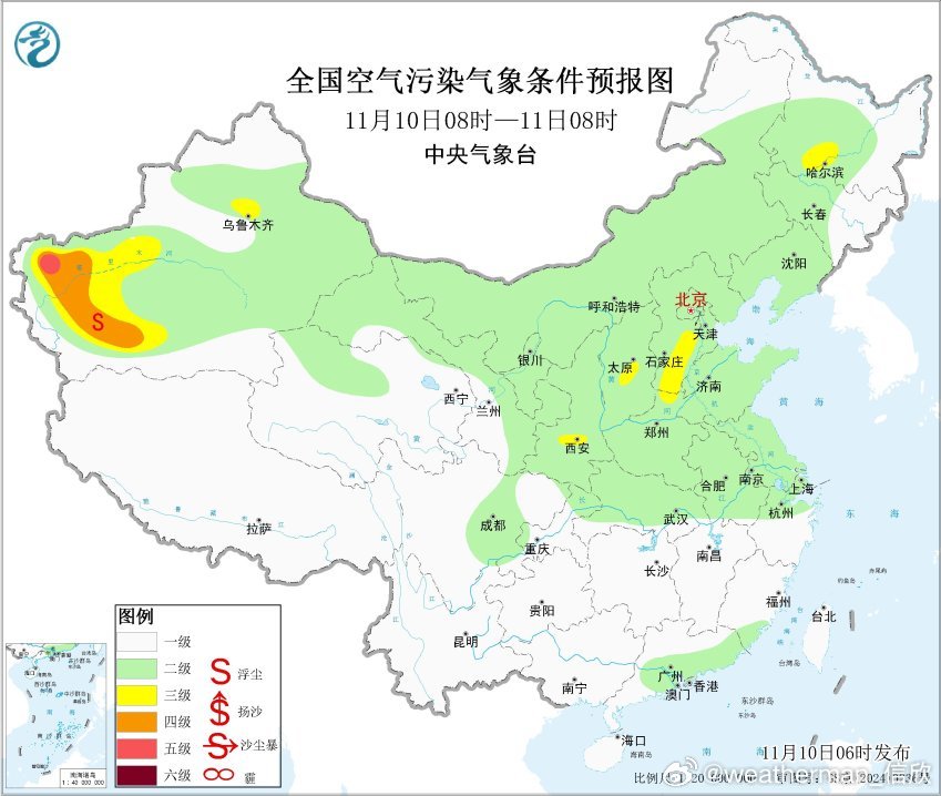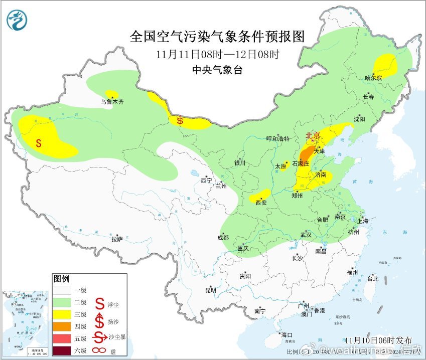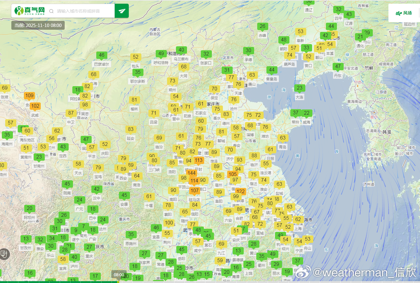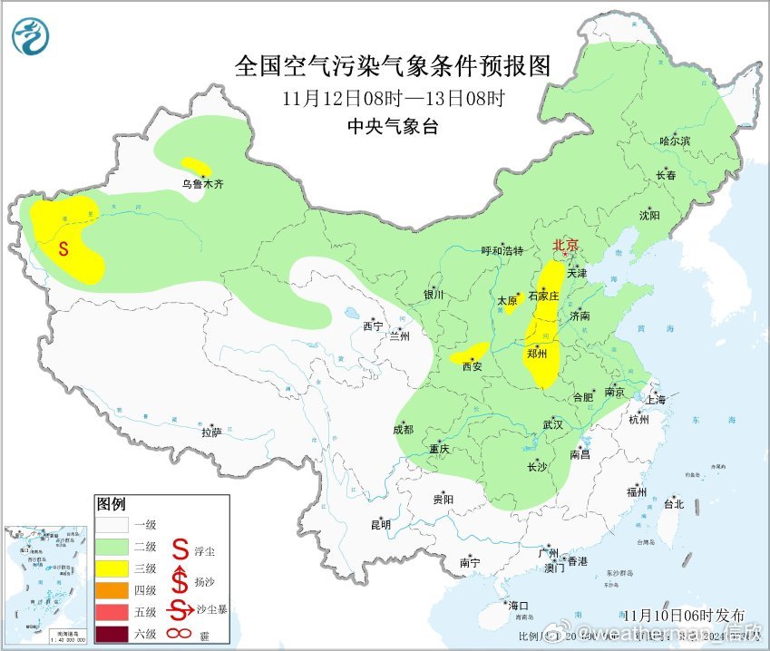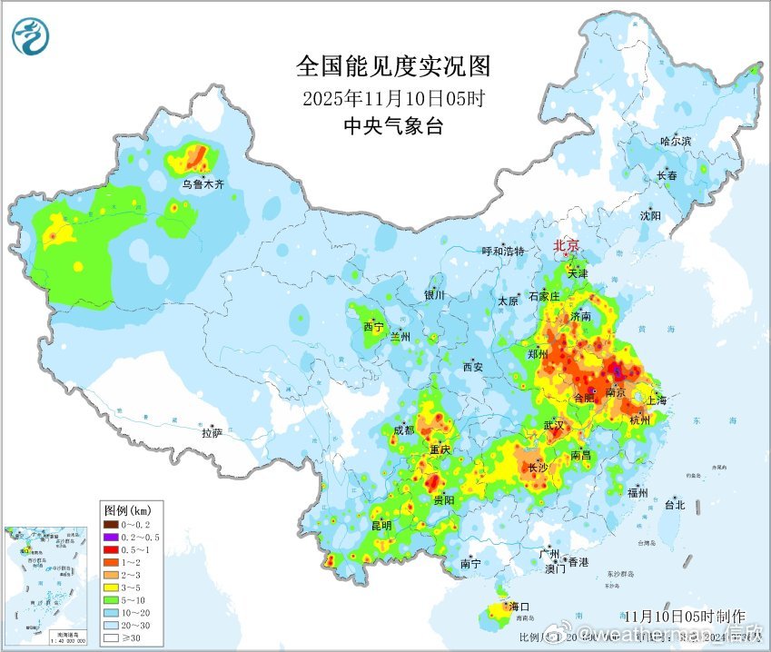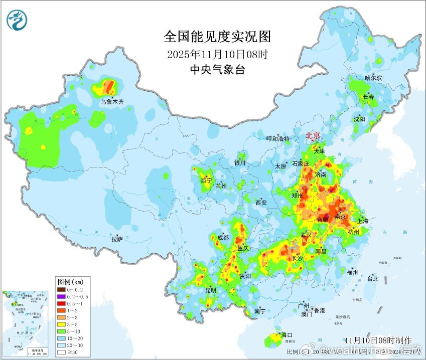 【雾和霾】今晨从空气质量看,没有明显的霾。不过因为湿度较大,在江苏安徽山东河南湖北湖南贵州等地出现了大雾。今晨7时,山东高青、江苏六合,今晨8时湖北金沙、江西庐山、湖南南岳,能见度不足100米。今天白天雾会减弱消散。明后两天,华北一带在冷空气活动间歇,可能还有些霾,但13日冷空气抵达,大气扩散条件又转好。