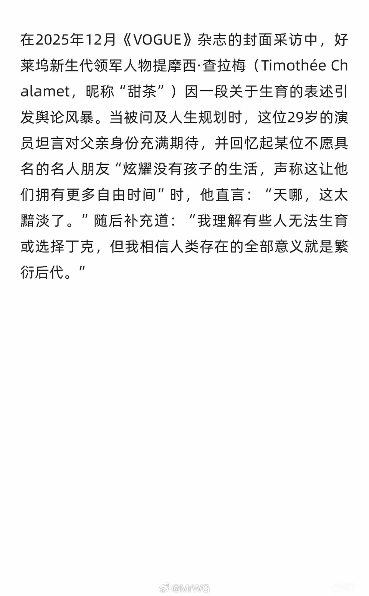 电影[超话]佳片奇遇季 “选择不生孩子的人是惨淡消极的”,“繁殖后代是人类存在的目的”[费解][疑问][便便]……来自2025十一月美版Vogue——这是装都不装了吗……谁允许你代表人类的……对甜茶,脱粉不送[弱],【沙丘3】可以抵制起来了~甜茶