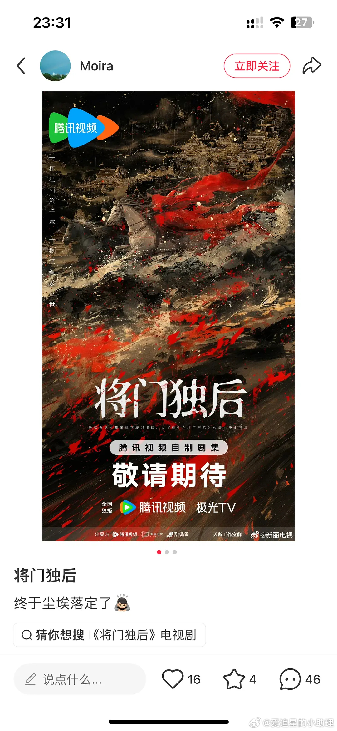 自传出接《将门毒后》,王鹤棣微博三天访问量涨30万