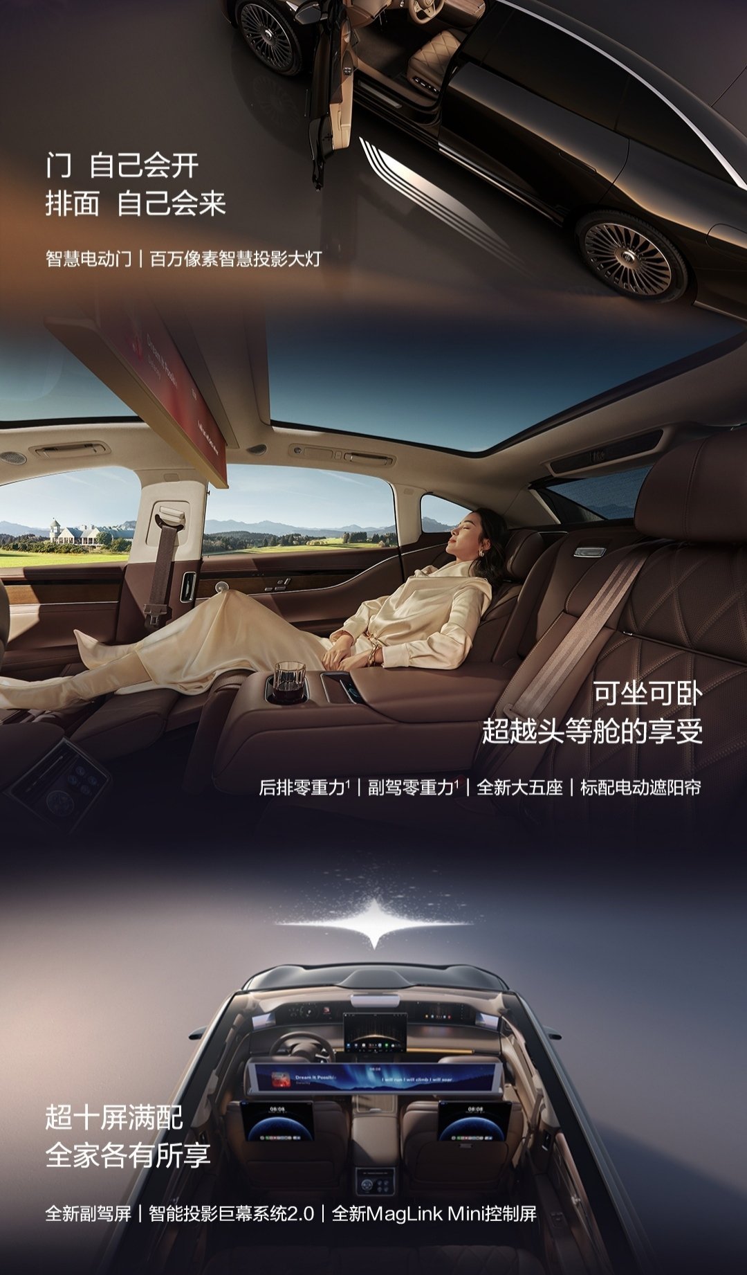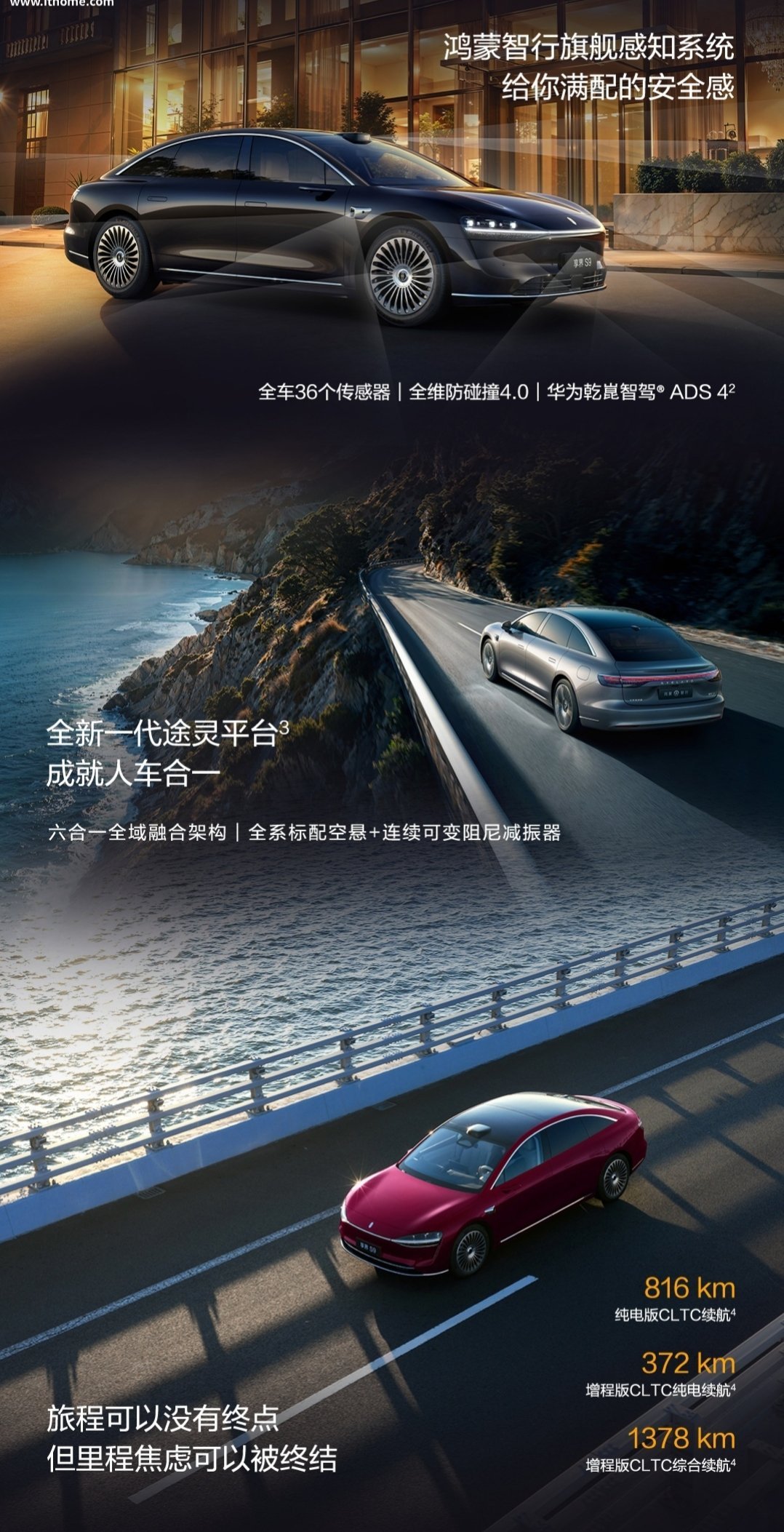 新车提供纯电、增程两种能源形式,纯电版车型 CLTC 续航可达 816km,增程版 CLTC 纯电续航 372km,综合续航可达 1378km。此外,新车全系标配空悬 + 连续可变阻尼减振器。