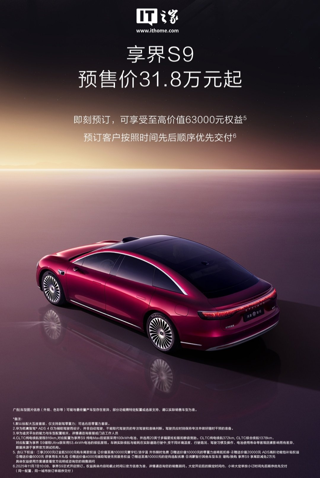 鸿蒙智行年度压轴新品 —— 新款享界 S9 已于 11 月 7 日 10:08 开启预订,预售价 31.8 万元起。