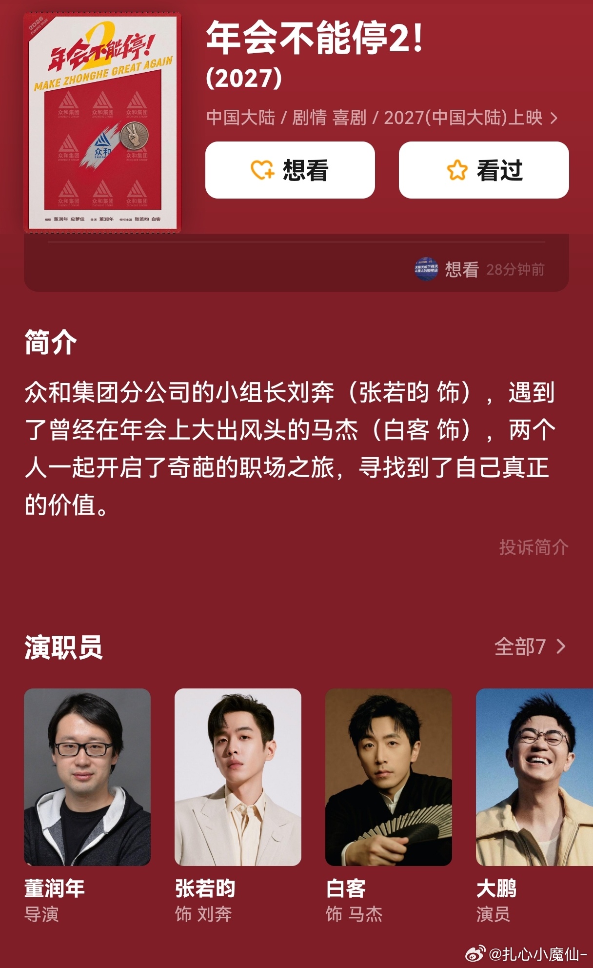 年会不能停2官宣张若昀白客《年会不能停2》官宣张若昀啦~,原班人马创作班底和新搭档一起开启众和新篇章,张若昀的观众盘没话说,期待新故事,期待年会不能停2[打call][打call]