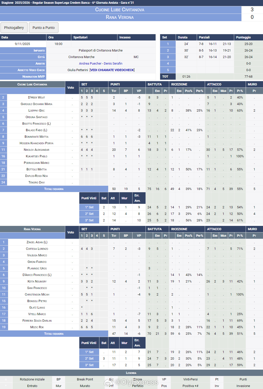 【意超男排鲁贝3-0终结维罗纳连胜 尼科洛夫20分】国际排坛战报速递 11月9日,意超男排第六轮,奇维塔诺瓦主场3-0(25-20/26-24/26-24)终结新贵维罗纳的连胜势头,不仅将对手拉下榜首,还以4胜1负13分追平佩鲁贾,排名联赛次席。尼科洛夫20分、洛普基14分,达兰15分、凯塔12分、莫兹奇11分。尼科洛夫还在比赛间隙领取了意超10月MVP奖。