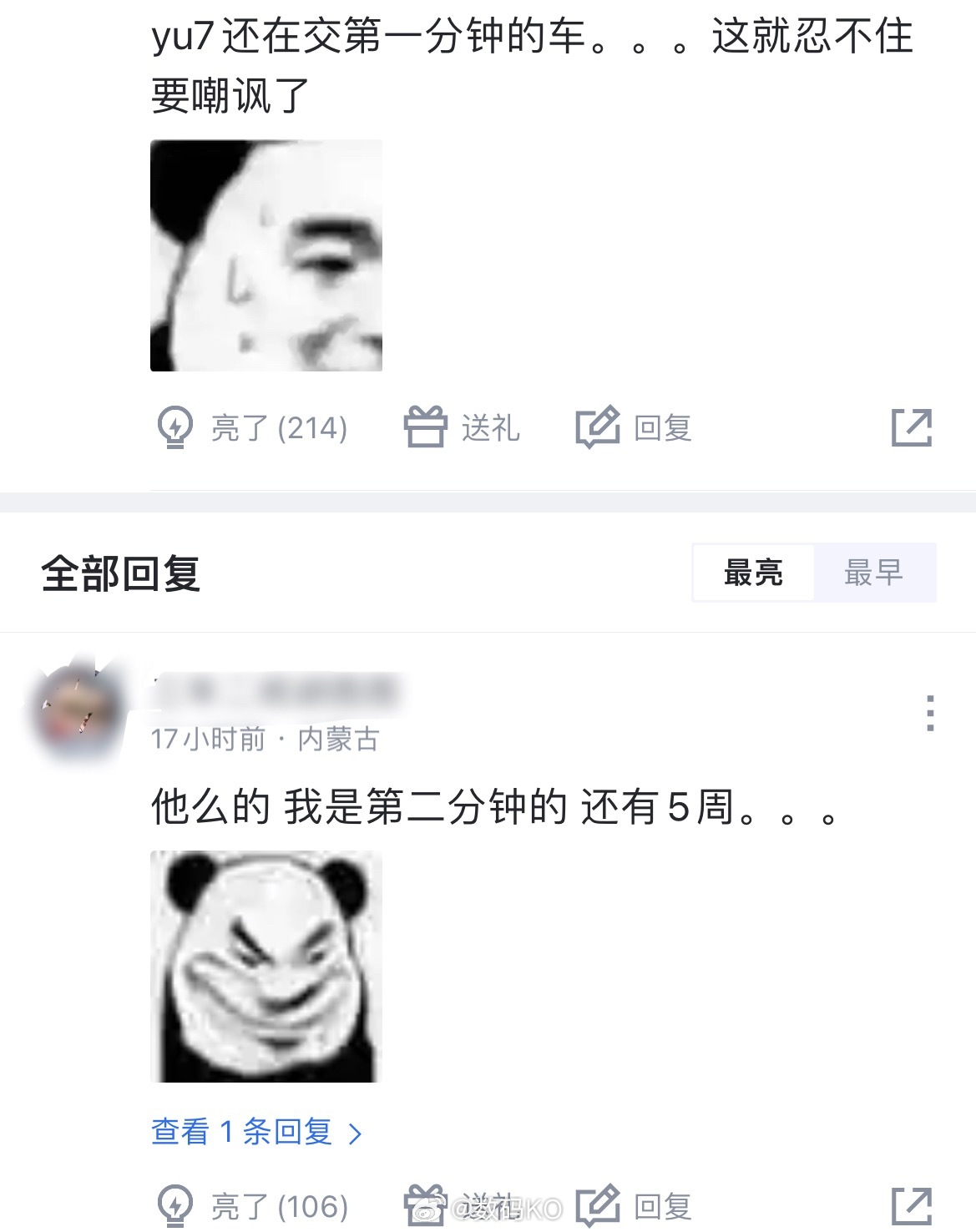 有人嘲讽小米YU7销量,网友直接回复小米YU7还在交付第一分钟订的车,这就忍不住嘲讽了。随后一网友又回复:我的第二分钟订的,还有五周。