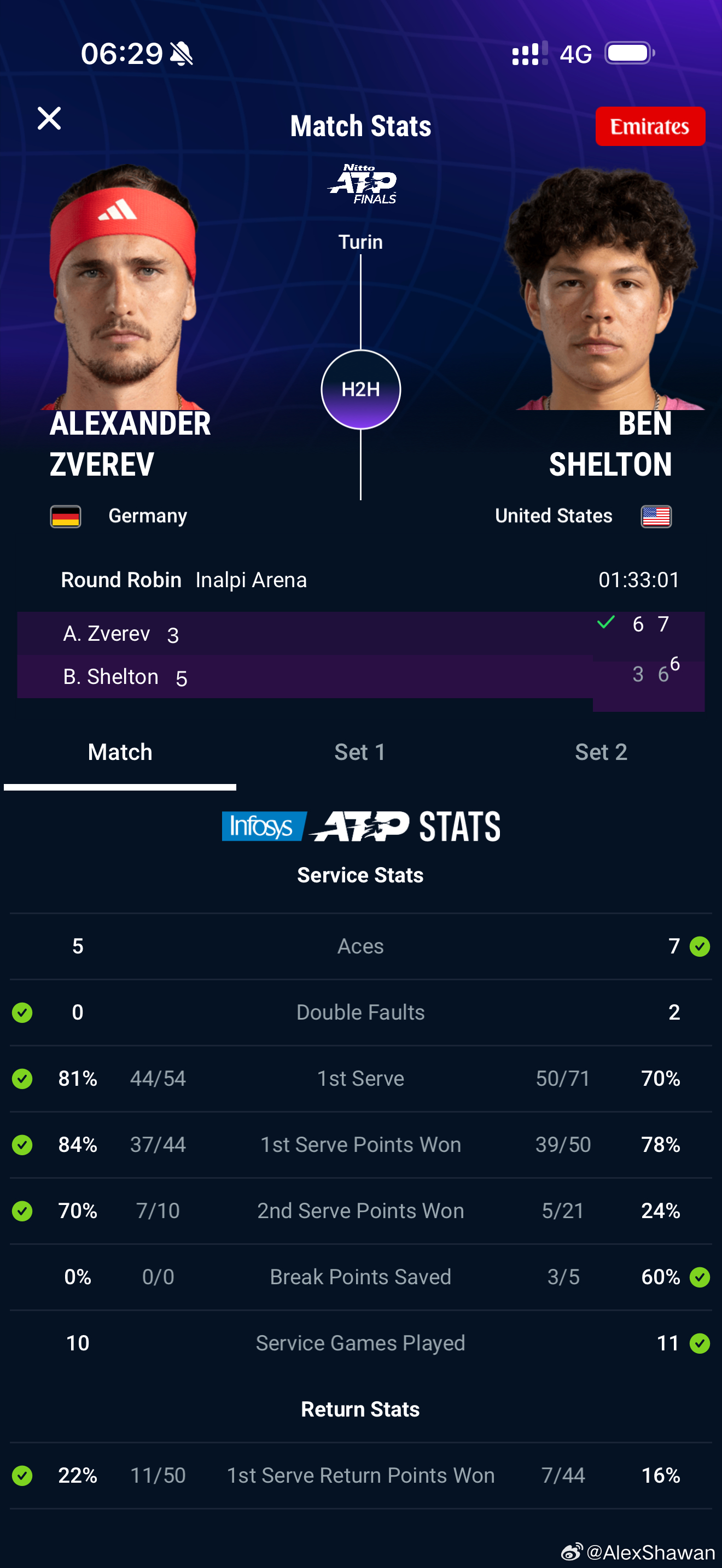都灵总决赛小组赛,兹韦列夫顶住了谢尔顿第二盘的反扑,凭借双双高于80%的一发进球率和得分率以6比3、7比6完胜对手,取得总决赛首胜。