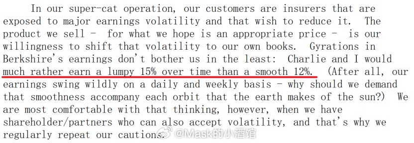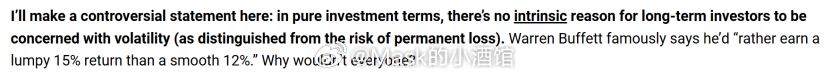 巴菲特也说过类似的话,他说宁愿要一个忽高忽低但平均能赚15%的投资,也不要一个平平稳稳但只能赚12%的投资!(出自:1996年BERKSHIRE HATHAWAY INC. Chairman's Letter)