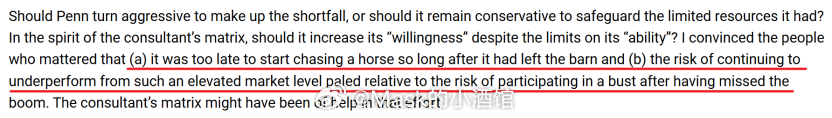 马克斯举了个自己的例子。2000年那会儿,他在宾夕法尼亚大学投资委员会当主席,当时互联网股票疯涨,很多人问他要不要追进去。他说了两句的话: