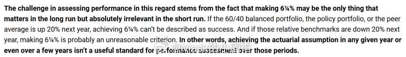 从长远看很简单,养老金只要能达到预定的收益率就算成功,比如每年赚6个点儿。但问题是,你不能等十年才去评价投资团队干得好不好吧?每年都得看看,每年都得决定该给谁加薪谁升职。