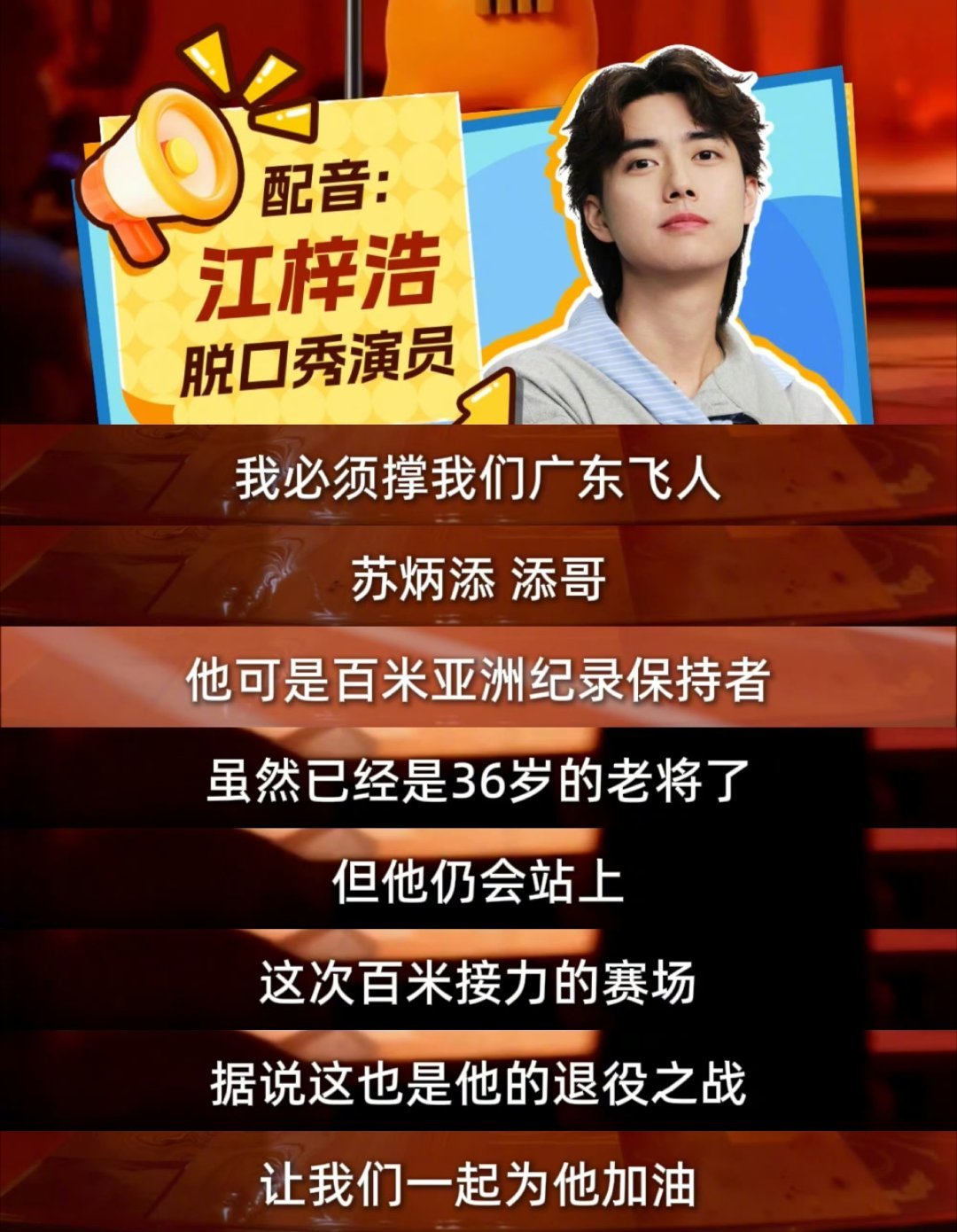 江梓浩脱口秀助阵全运会江梓浩全运会力挺王楚钦 粤港澳全运会迎来幽默加持!江梓浩用体育脱口秀为健儿助威,既点赞“神仙阵容”,又力挺2025年斩获11冠的王楚钦,跨界组合超吸睛~