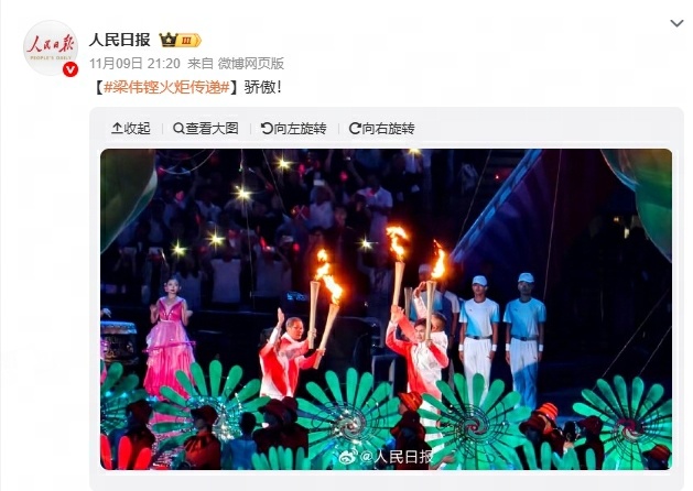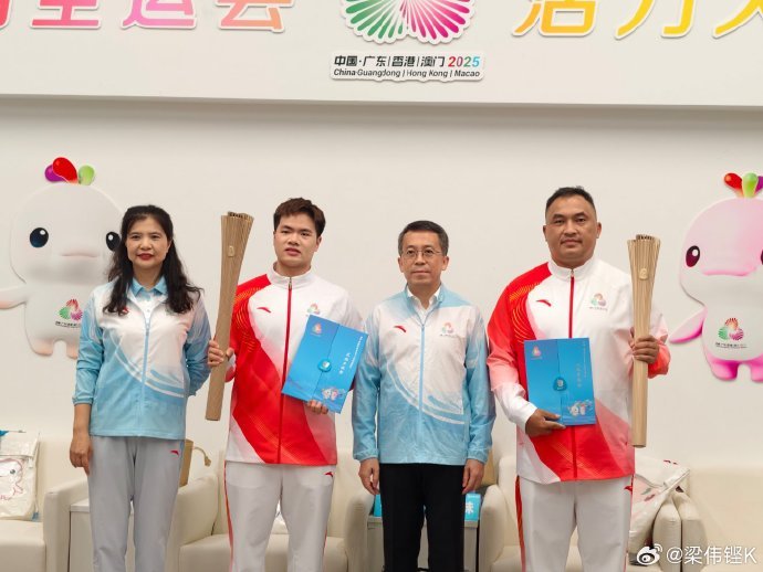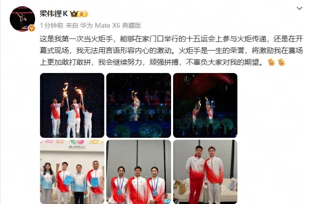 梁伟铿晒图发博:这是我第一次当火炬手,能够在家门口举行的十五运会上参与火炬传递,还是在开幕式现场,我无法用言语形容内心的激动。火炬手是一生的荣誉,将激励我在赛场上更加敢打敢拼,我会继续努力,顽强拼搏,不辜负大家对我的期望。🫡🫡