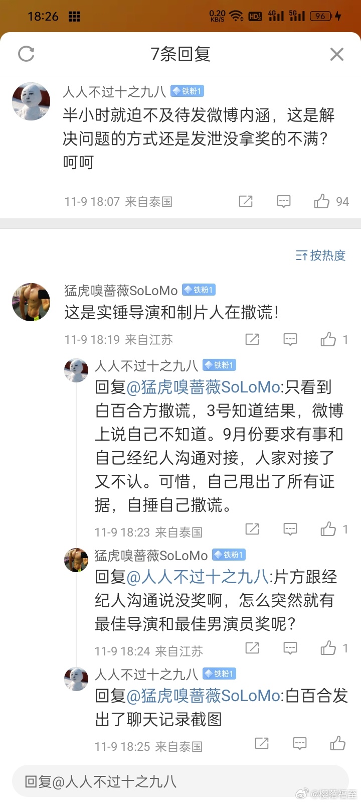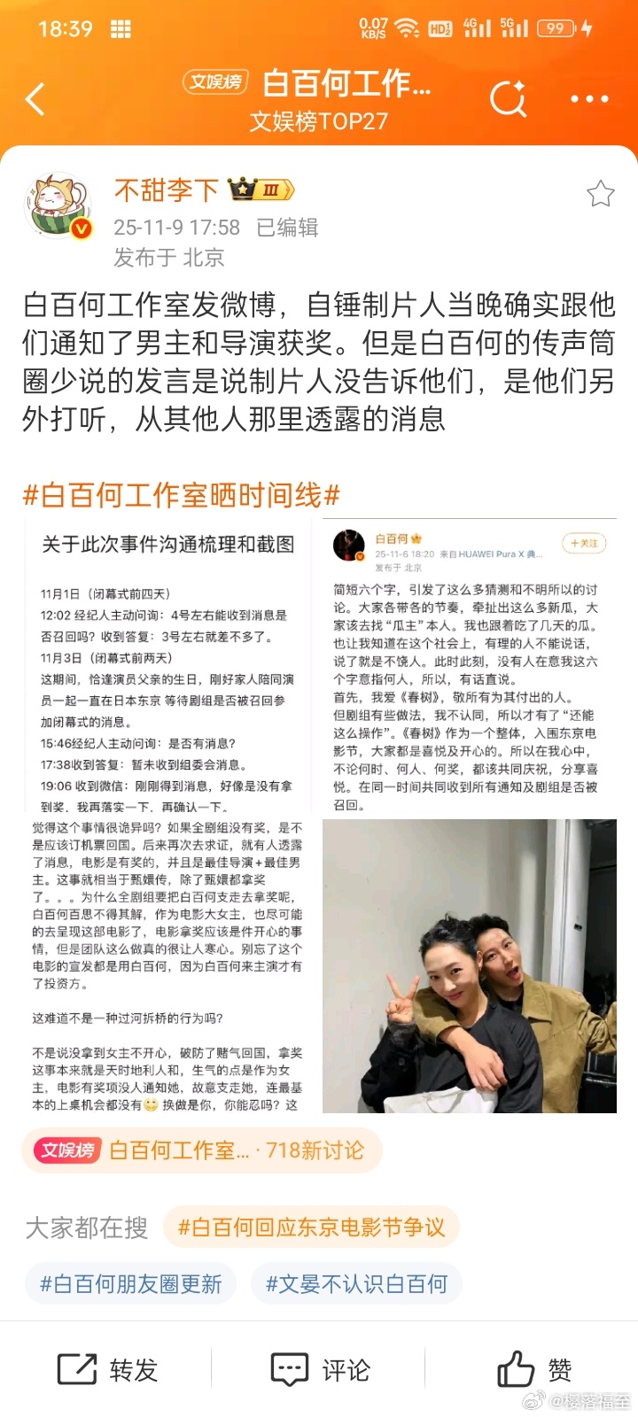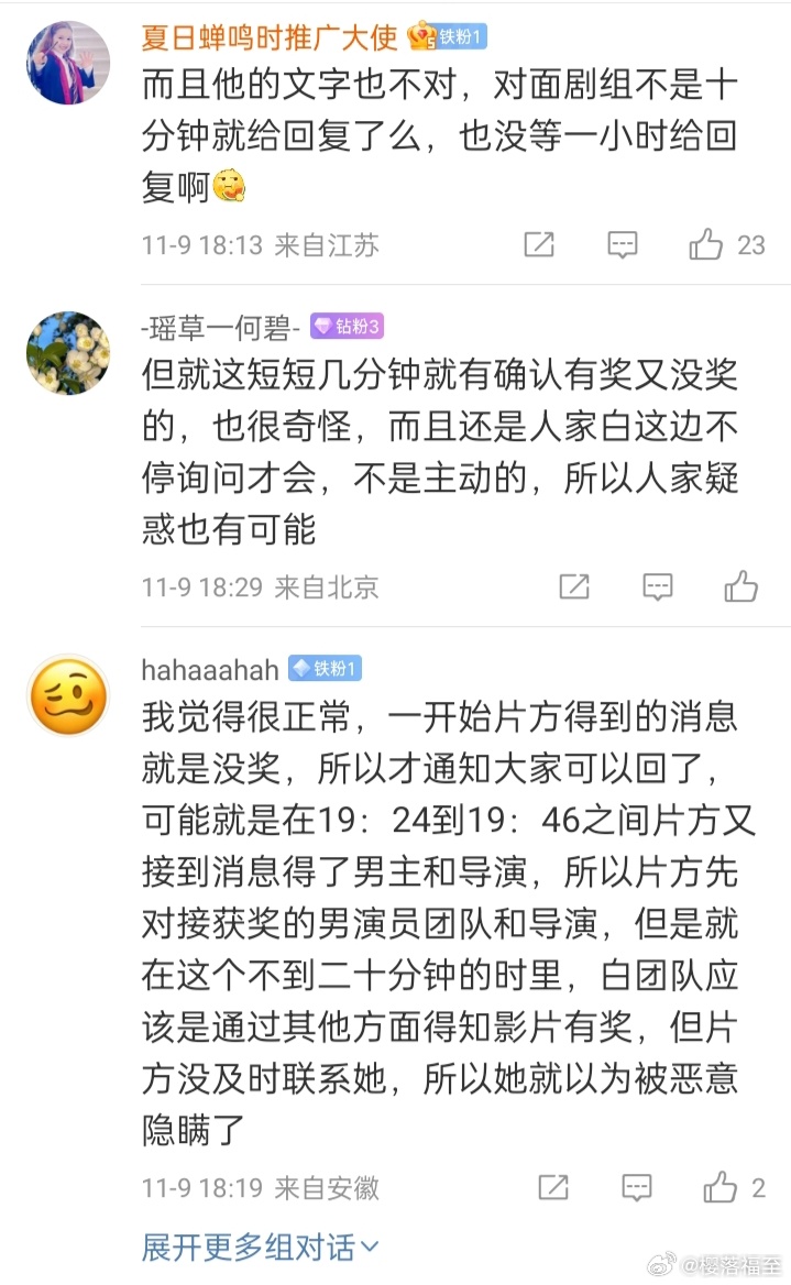 11月3日晚估计8点前制片那边自己都以为没拿奖,但确定有奖后,在白百何那边不停的追问下,8点06分就第一时间告知拿了最佳导演跟最佳男演员,并没有瞒着。