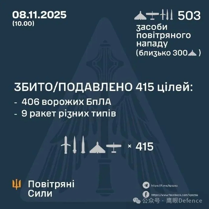 烽火问鼎计划 当地时间11月8日夜间,俄罗斯军队再次对乌克兰发动了一次大规模空袭,俄军在这次空袭中发射了458架自杀式无人机、25枚“伊斯坎德尔-M”或KN-23弹道导弹、7枚“匕首”空射弹道导弹、3枚“口径”巡航导弹,尽管乌克兰防空部队击落了406架自杀式无人机和9枚不同型号导弹,但依然有26枚导弹和52架自杀式无人机突防成功。