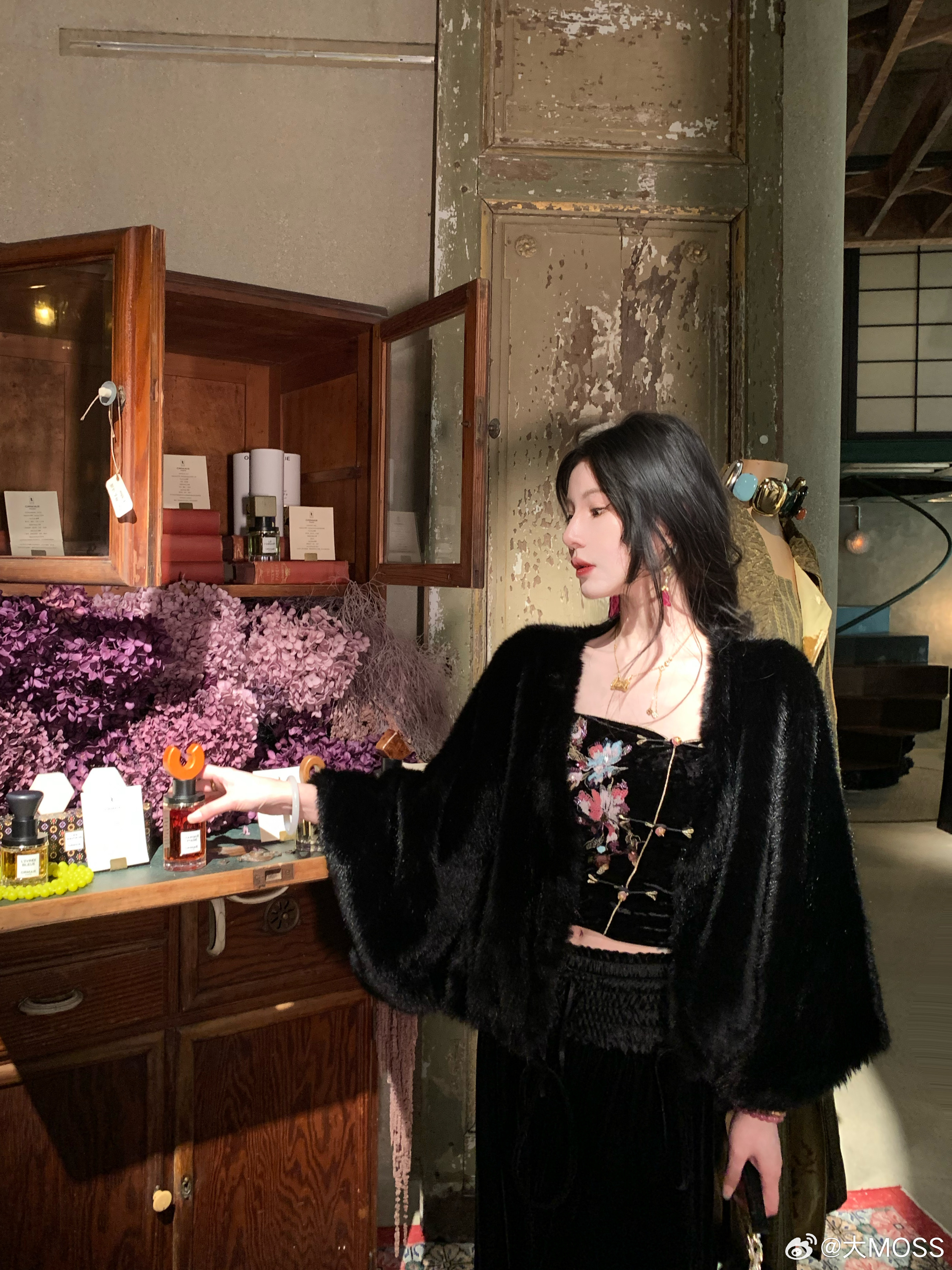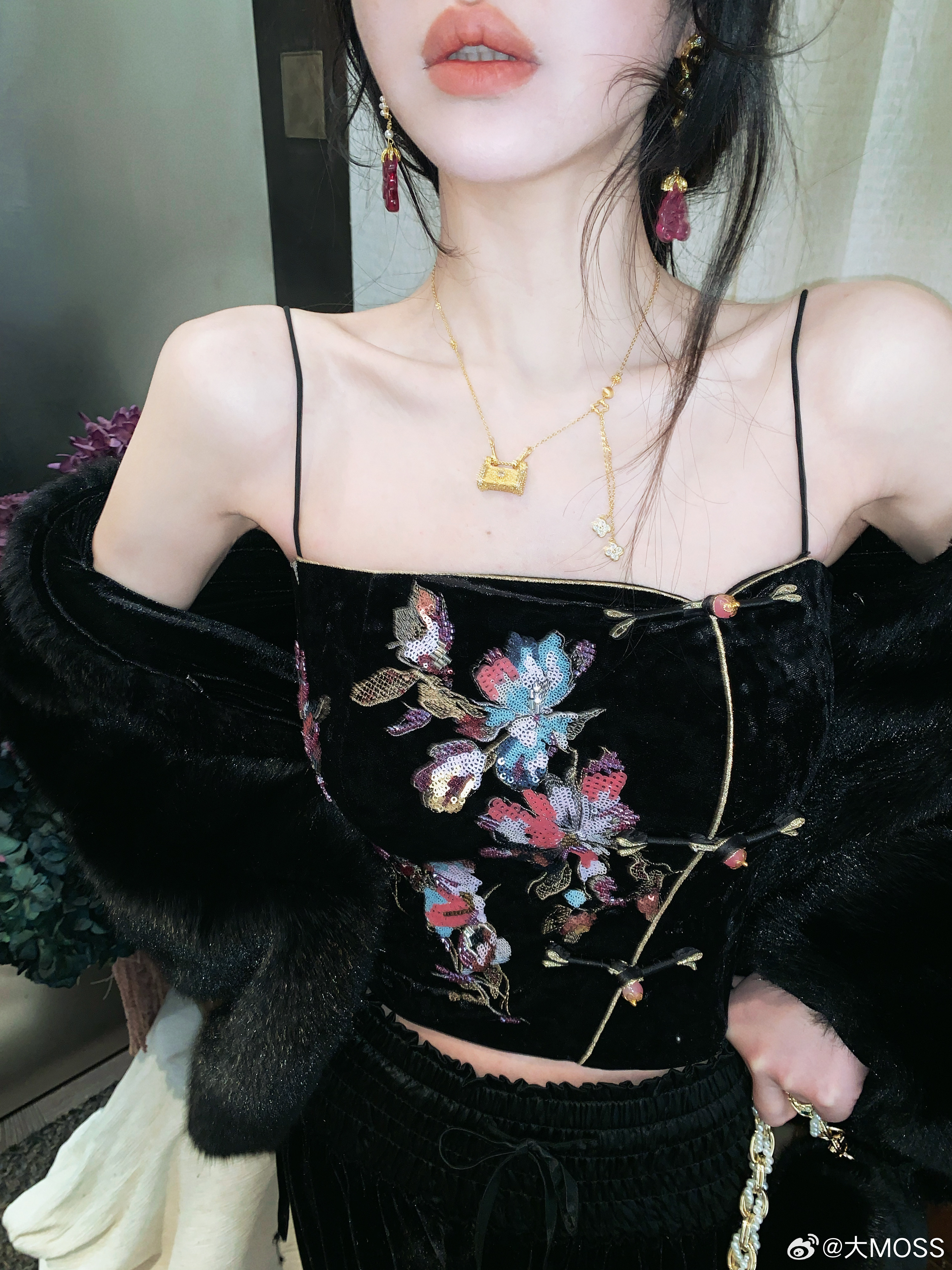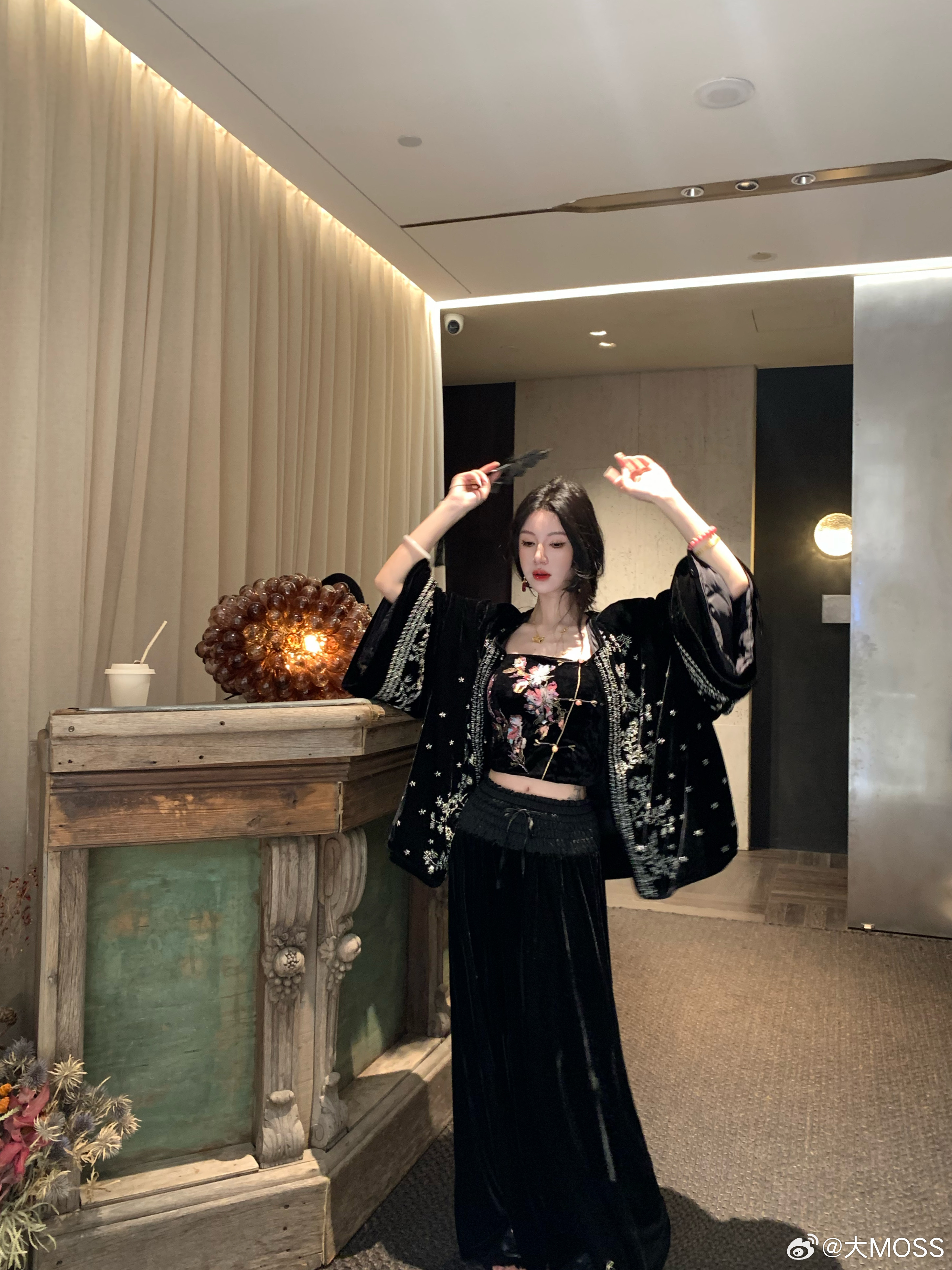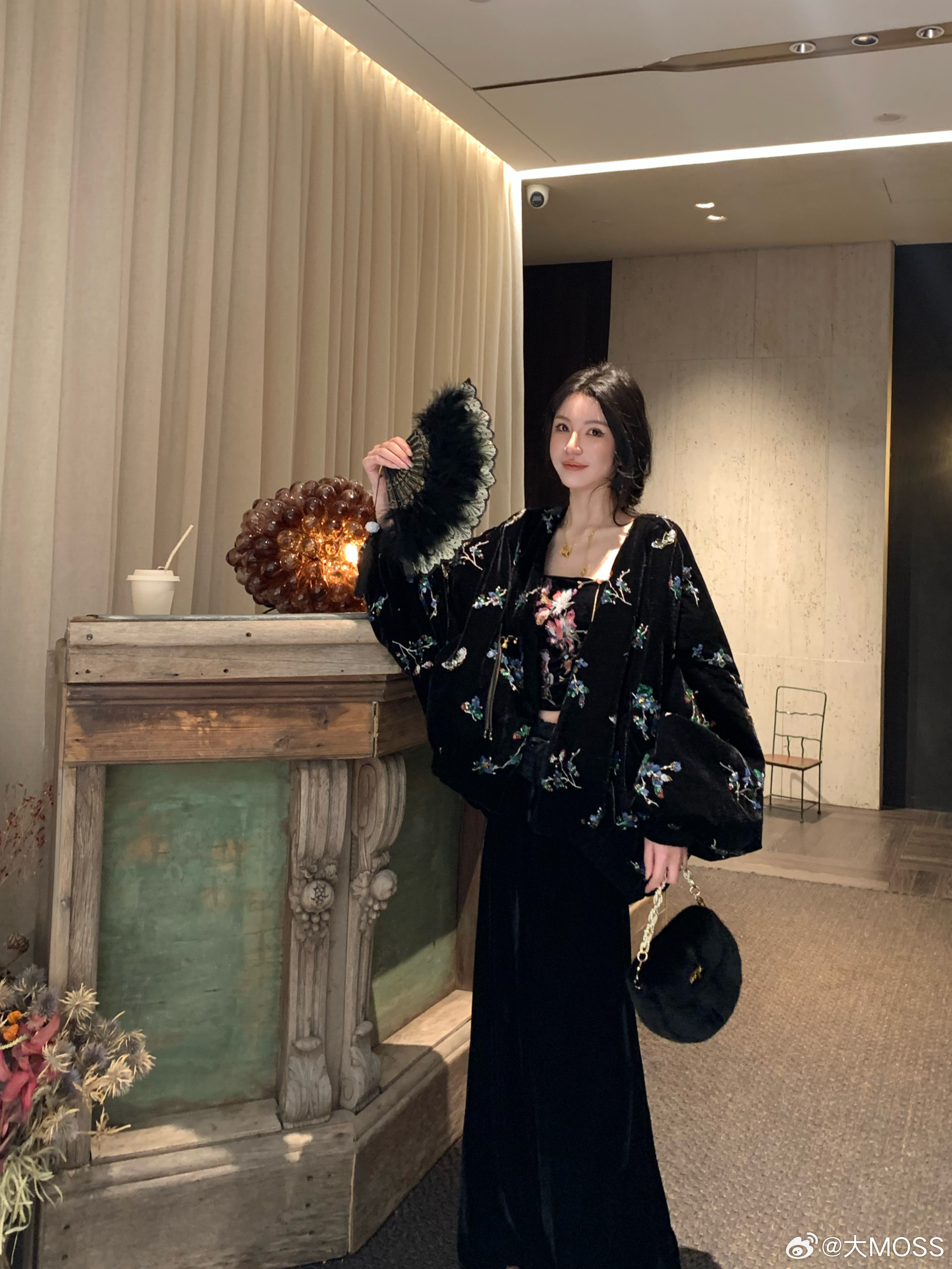 采用系带设计,可收可放间尽展穿搭的层次感💡宽松的版型设计十分百搭。烟墨黑枫叶莲珠绣丝绒面料🪡如暗夜丝绒殷神秘雅