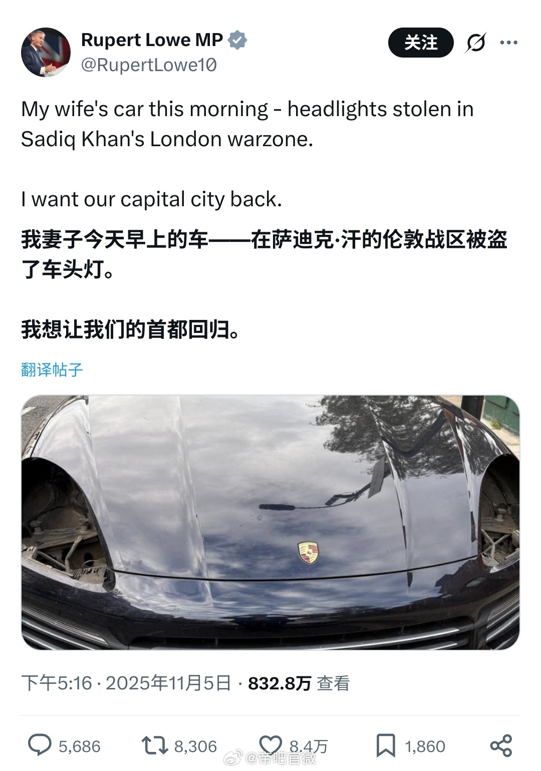 网友:英国一位反对移民的议员发推称其妻子汽车的两个大灯在伦敦被偷了,一小时后出现一名伦敦网友售卖同款大灯。