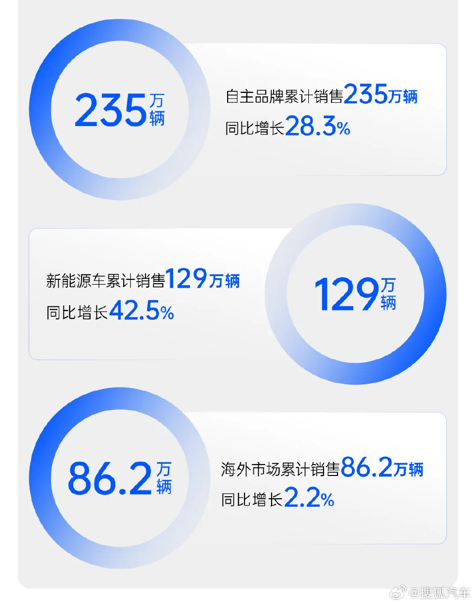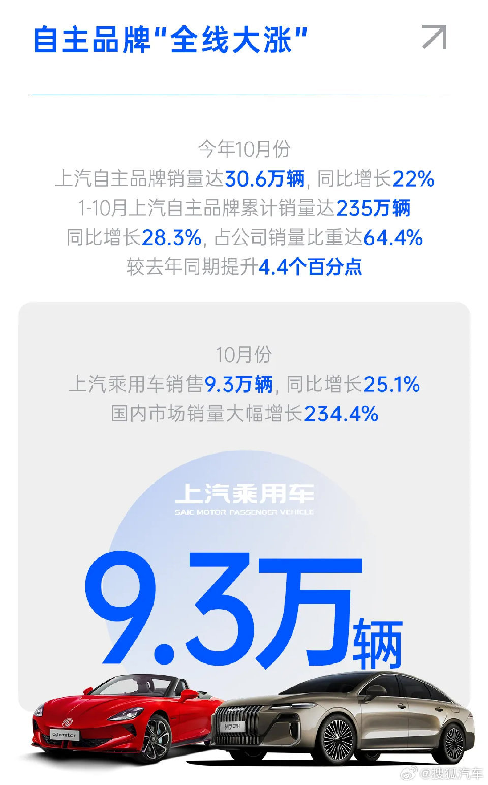 【同比增长13% 上汽集团10月销售整车45.4万辆】日前,上汽集团公布10月销售整车45.4万辆,同比增长13%;1-10月整车批售364.7万辆,同比增长19.5%,终端零售383.4万辆,中国品牌累计销售235万辆,新能源车累计销售129万辆,海外市场累计销售86.2万辆。MG4新能源汽车