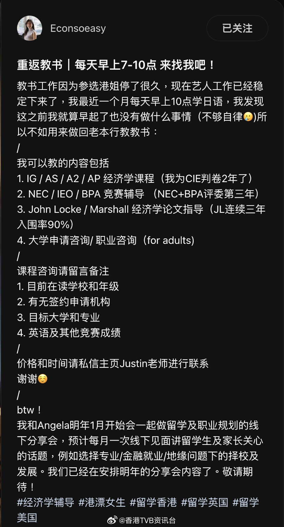 但当正当演艺事业上升之际,袁文静近日竟突然宣布重掌教鞭,回去教书?惹来不少网民揣测,是否退出娱乐圈?原来非也,事实是袁文静见演艺工作越趋稳定,所以运用空余时间做回「老本行」,她在自己另一个社交平台以「重返教书|每天早上7-10点 来找我吧!」为题,写道:「教书工作因为参选港姐停了很久,现在艺人工作已经稳定下来了,我最近一个月每天早上10点学日语,我发现这之前我就算早起了也没有做什么事情(不够自律),所以不如用来做回老本行教教书。」并列出有关经济的教学课程,实行演艺、教学「双轨并行」。不少网民都大赞袁文静超级优秀,不只有样貌,还很有内涵,纷纷留言:「事业大女主,超级优秀」、「太可怕了,好强」,指她是真正的「美貌与智慧并重」!