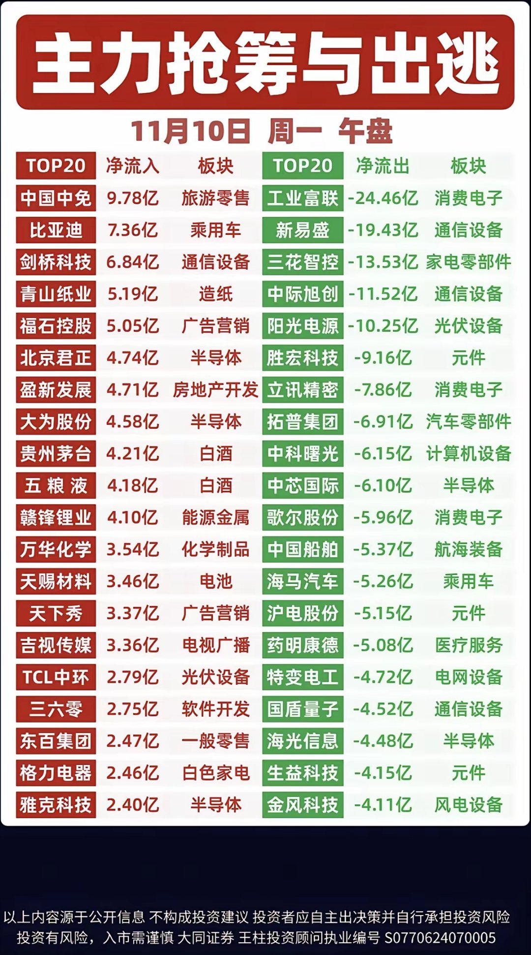 11.10周一 抢筹出逃:大资金流向追踪!
