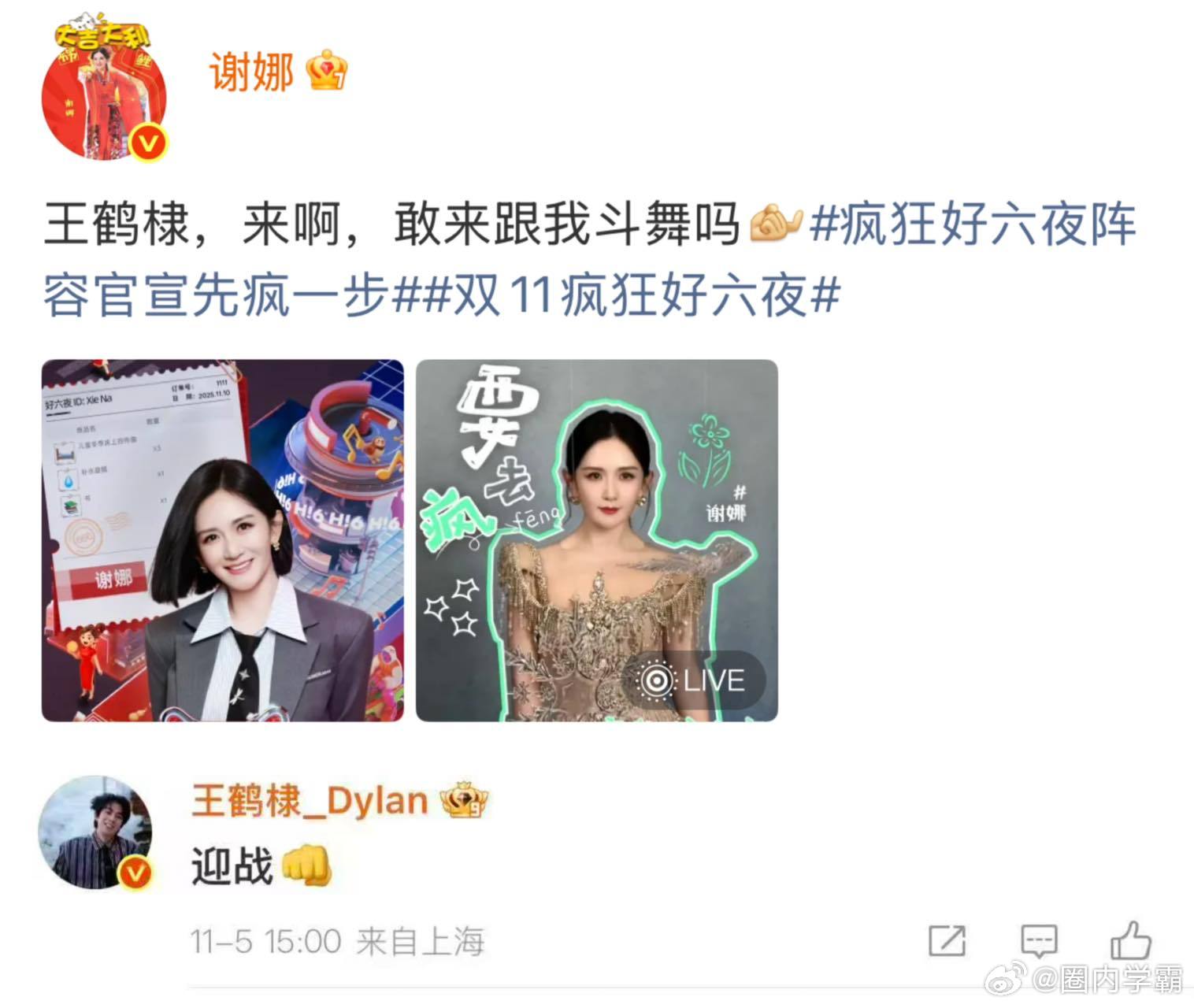 王鹤棣对谢娜说奉陪到底双11疯狂好六夜 谢娜和王鹤棣的舞蹈斗争简直让人期待!两个人从高铁上的求饶到舞台上的“宣战”,这一场斗舞注定会充满笑点,今晚的直播,大家千万不要错过!