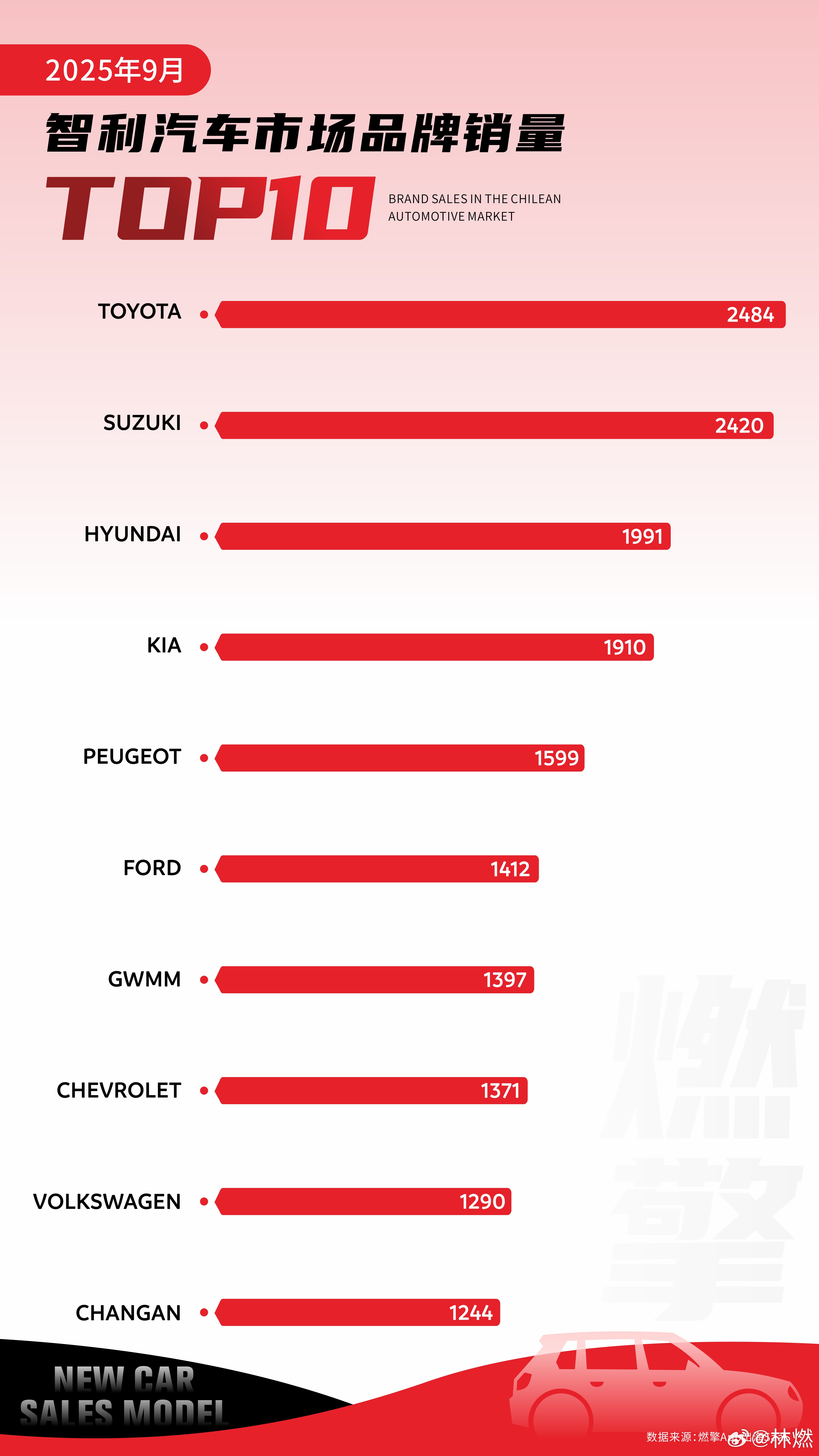 9月智利汽车市场呈现日系品牌领跑、韩系紧随、中国品牌突破性渗透、传统国际品牌分层竞争的格局。
