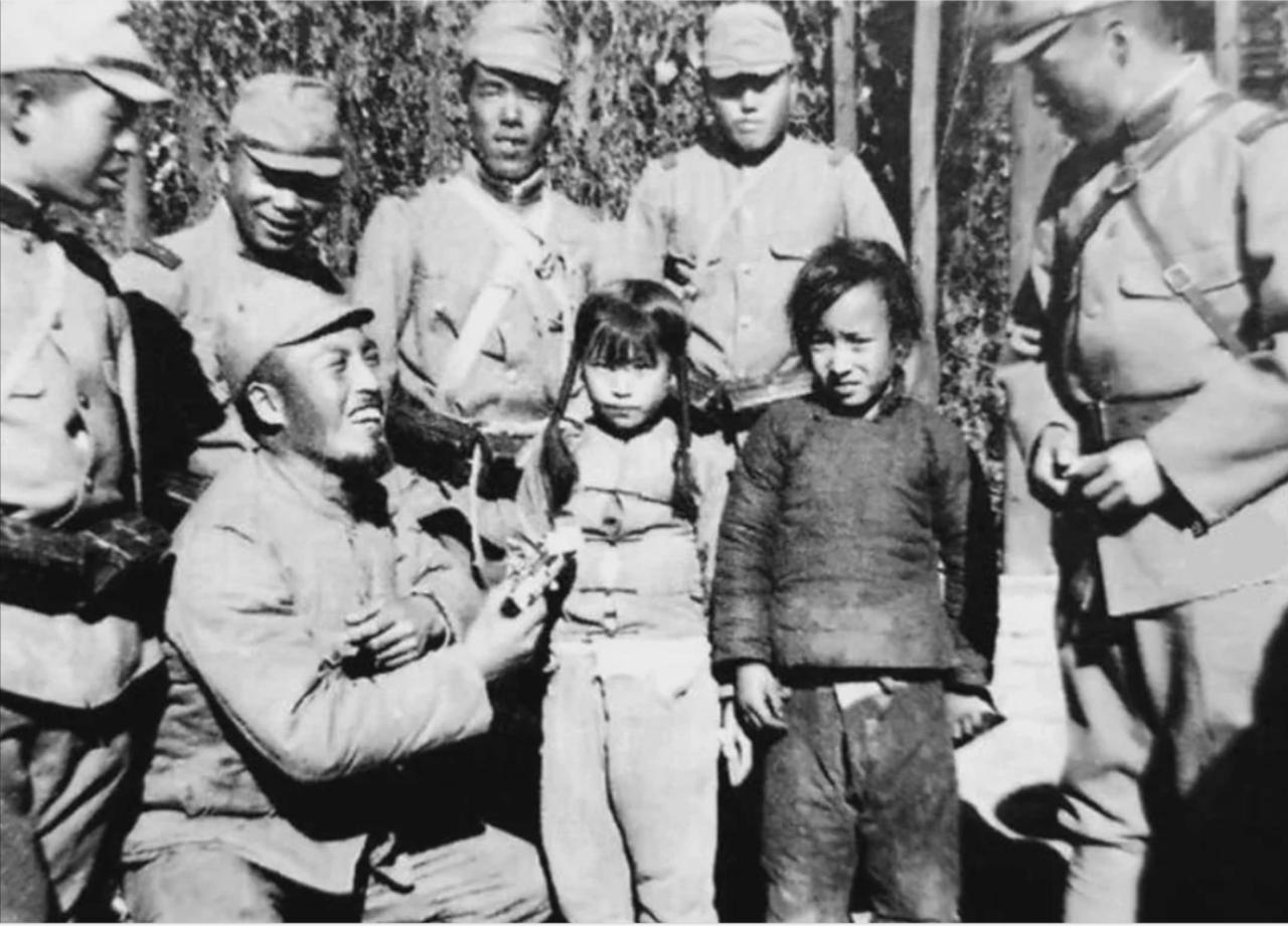 这张拍摄于1937年南京大屠杀期间的照片,画面里,几名身着军装的日本士兵环绕着两名中国儿童,孩子满脸恐惧、衣着褴褛,眼神中满是对战争的惊惧与无助。