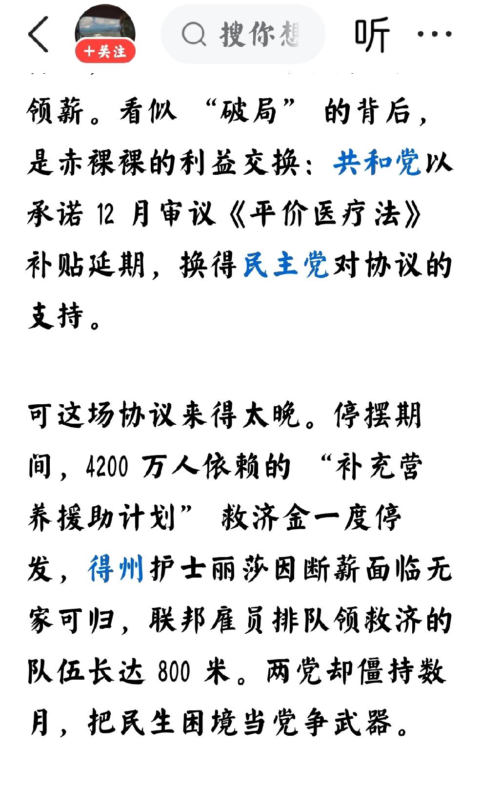 美国人民是武器 个人观点:真相是世界上大多数人,无法接受的事实。 美国政府,开门营业的条件是:“共和党以承诺12月审议《平民医疗法》补贴延期,换得民主党对协议的支持。 原来是一场交易,美国人的民生问题不是焦点,而是美国上层社会的代表-政客们的交易-交换,才是重点。 美国民众,真是爹娘都不要的孩子。只是武器而已。