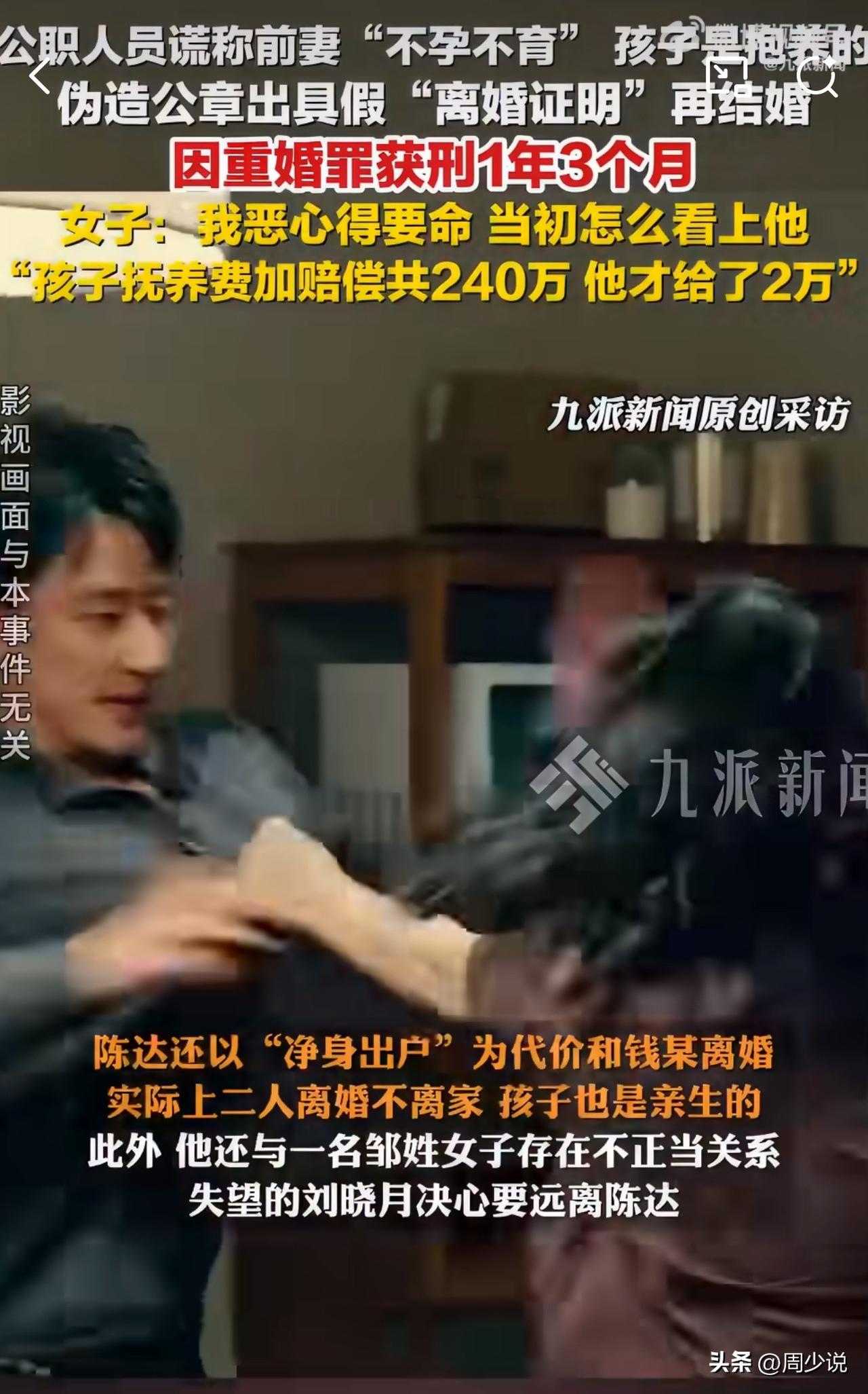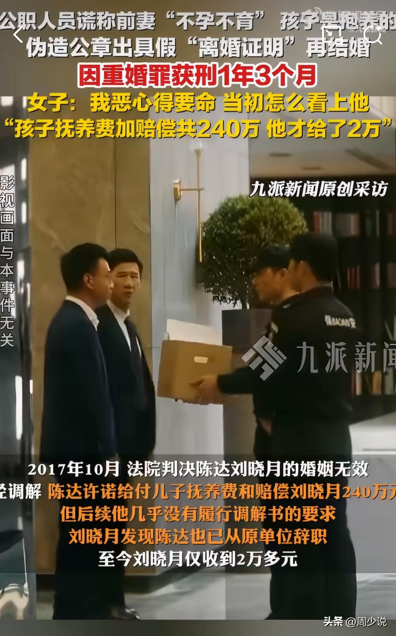 公职人员竟伪造公章骗婚,被判重婚仅赔2万?前妻更是发声:他至今不知悔改! 近日,刘晓月(化名)的遭遇引发热议。2011年,她与南京某单位副调研员陈达(化名)领证,却不知对方尚未与前妻钱某离婚,所用离婚证系伪造公章出具。 谎言败露后,陈达假意离婚稳住刘晓月,实则与前妻“离婚不离家”。2017年,法院判决二人婚姻无效,调解陈达支付孩子抚养费及赔偿共240万元。但截至目前,刘晓月仅收到2万余元。 上月,陈达因重婚罪获刑一年三个月,刘晓月不满判决,认为量刑过轻,且陈达庭审中竟以“民政局审查疏忽”辩解,毫无悔意。十三年来,她独自抚养两个孩子,维权之路步履维艰,仍坚持举报其拒执、伪造公章等行为。 此事引发网友热议,有网友说:“公职人员知法犯法,太恶劣!240万给2万,毫无担当!” 还有网友更是坦言:“对孩子不管不顾,对法律毫无敬畏,必须严惩!” 周少认为,公职人员本应恪守法律底线,陈达伪造公章、重婚骗婚且拒不履行赔偿,不仅违背职业操守,更践踏法律尊严。 前妻独自扛下生活重担坚持维权,这份坚韧令人动容。期待相关部门彻查,让失德违法者付出应有代价,还受害者公道,彰显法律的公正与威严。#寻美三湘# #长沙新朋友#