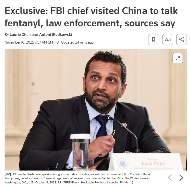 路透社爆料:FBI局长帕特尔已秘密访华。