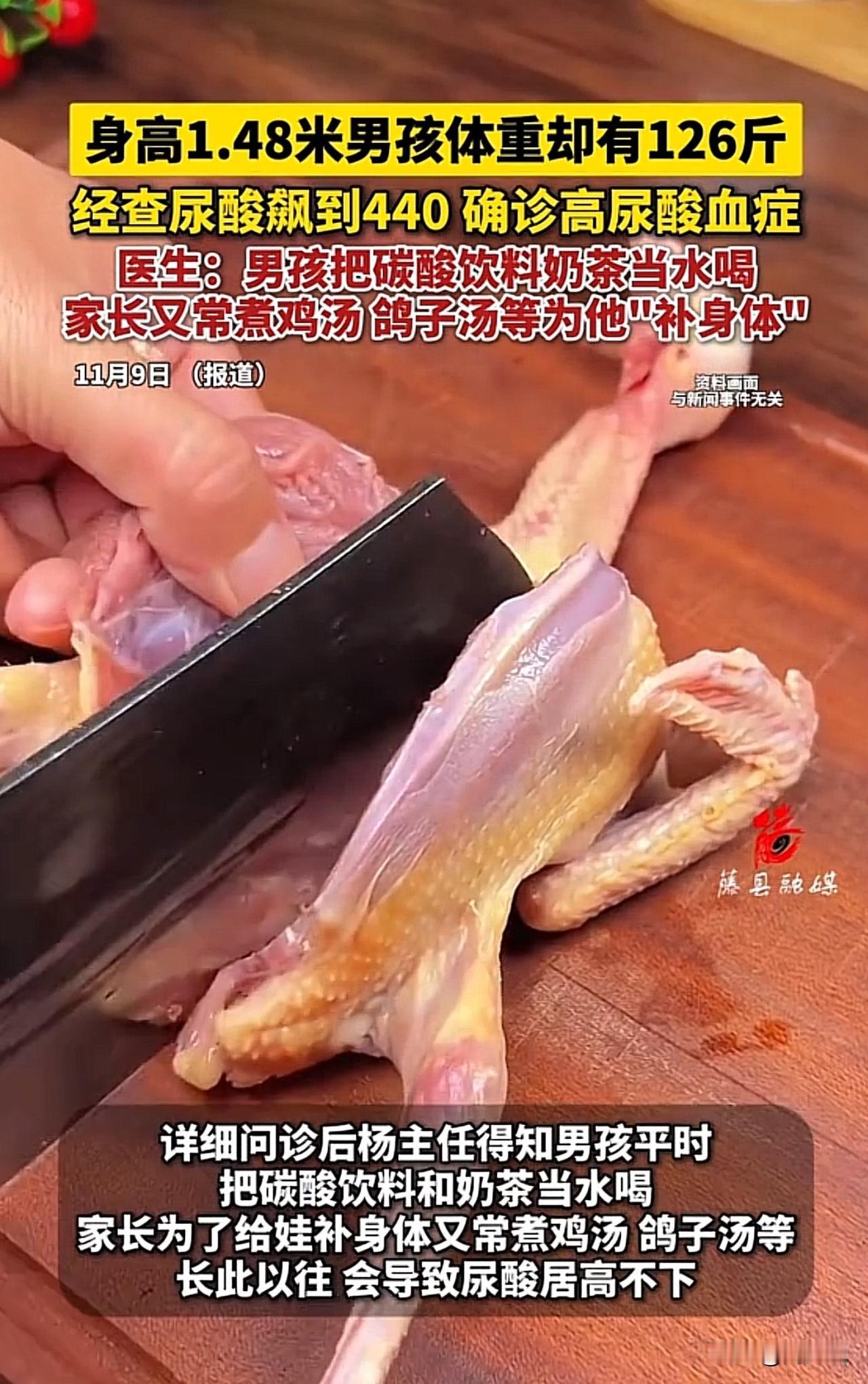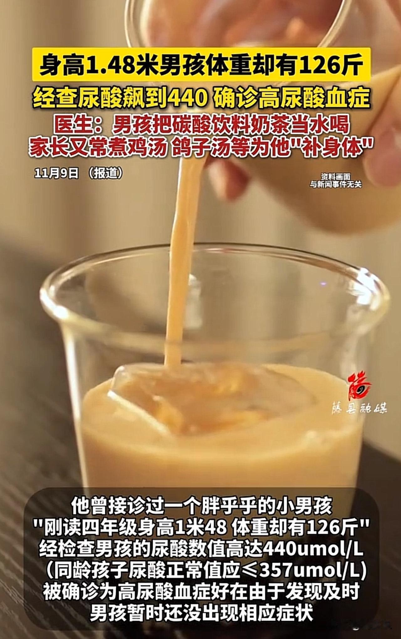 #126斤小学生尿酸飙到440#四年级男孩126斤!尿酸飙到440,罪魁祸首竟然是家长! 浙江一位四年级男孩,身高1米48,体重却达126斤,肚子圆滚滚像个小皮球。就医检查后,尿酸数值高达440umol/L,远超同龄孩子≤357umol/L的正常值,确诊高尿酸血症,万幸暂未损伤肾脏、未出现痛风症状。 医生问诊发现,男孩日常把奶茶、碳酸饮料当水喝,家长还总煮鸡汤、鸽子汤等给娃“补身体”。长期高糖饮品+高嘌呤浓汤摄入,让尿酸居高不下,也催胖了孩子。 此事引起网友热议,有网友说:“以为痛风是中老年病,没想到娃也会得!” 也有网友表示:“家长的爱用错了地方,补身体不是瞎补啊!” 还有网友更是坦言:“奶茶、浓汤就是隐形健康杀手,得从小管住嘴!” 周少想说痛风早已不是中老年专属,这也不是个例,痛风正愈发年轻化。孩子尿酸飙升,根源在不良饮食:高糖饮品会阻碍尿酸排泄,浓汤嘌呤含量极高。 家长切勿陷入“进补误区”,以为多喝汤就是对孩子好。守护娃的健康,不如少喝奶茶浓汤,多喝白开水、搭配清淡饮食,从小养成健康习惯,才是真的为孩子负责! 对于这位四年级男孩126斤尿酸飙到440,大家怎么看呢?#MCN双量进阶计划# #寻美三湘#