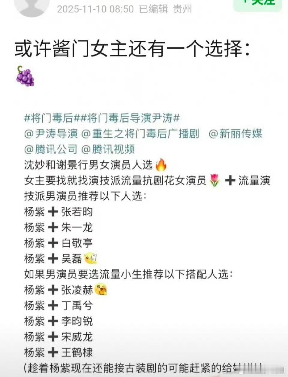 网友将门毒后推荐杨紫来演女主,但我觉得杨紫现在接的都是好班底正剧,不会再演这种了