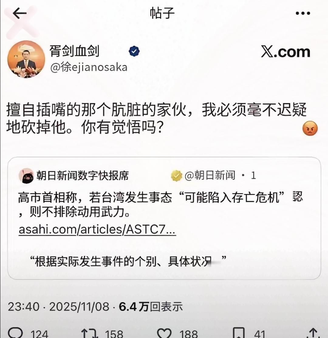 “斩首说”引爆日本! 日前,针对日本新首相高市早苗声言如果台湾有事,日本将动用武力干预,中国驻日本大阪总领事薛剑在社交平台评论:“只能毫不犹豫地斩掉那擅自闯入的肮脏头颅。你已经做好心理准备了吗?” 日本方面对薛剑总领事的评论反应如此激烈,其实是做贼心虚。他们自己主动挑衅东方大国主权,却容不得正常回应,这是典型的霸权逻辑。 日本一直以来都妄图在地区事务中刷存在感,对东方大国的内政指手画脚。高市早苗声言武力干预,完全是不顾后果的冒险之举。 东方大国向来爱好和平,但在主权和领土问题上绝不含糊。日本若继续执迷不悟,必将为自己的错误行为付出沉重代价。 如今只是口头警告,若日本依旧挑衅,那东方大国采取行动也在情理之中。日本应该认清现实,收敛自己的不当言行,避免局势进一步恶化。