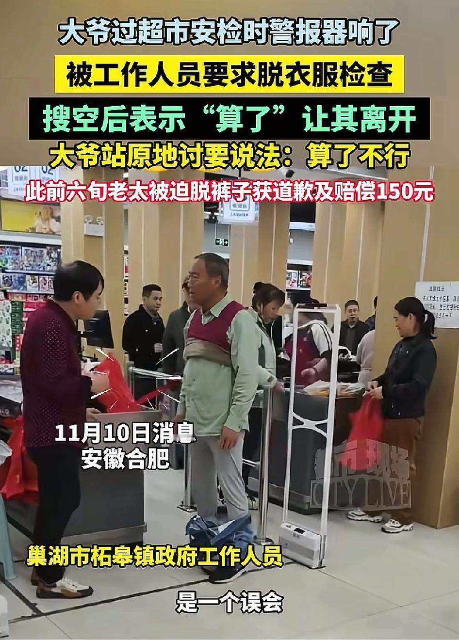 老人经过超市安检时警报响起,被要求脱衣检查无果,工作人员表示“算了”让其离开,老人拒绝离开称“算了不行”! 我觉得不管是被要求脱衣服,还是大爷激动自证清白脱衣服,关键是安检警报响了,那就是超市的问题。超市第一时间应该道歉承认自己的错误,而不是轻飘飘一句算了,让老人觉得没面子,没感觉到尊重没有台阶下。 算了,给人一种很宽容、大度的感觉,就好像自己占理,但又不追究人家责任了。你们怎么看?