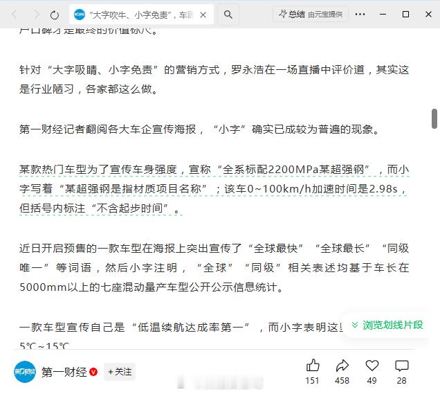 1、某款热门车型为了宣传车身强度,宣称“全系标配2200MPa某超强钢”,而小字写着“某超强钢是指材质项目名称”;该车0~100km/h加速时间是2.98s,但括号内标注“不含起步时间”。