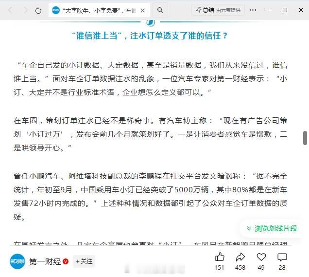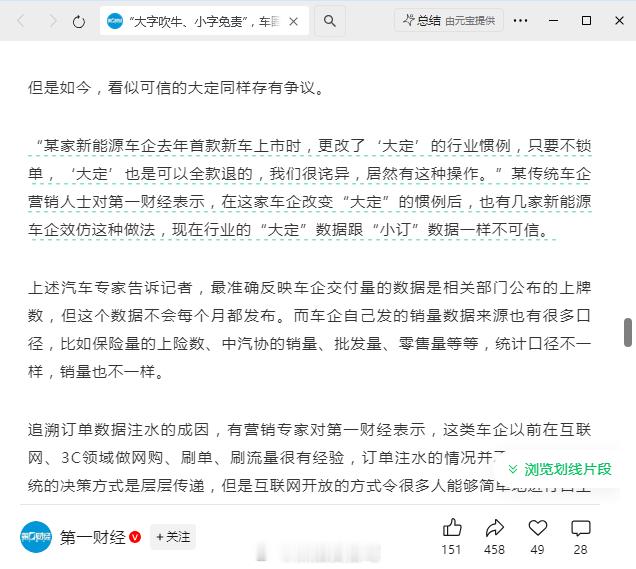 2、“某家新能源车企去年首款新车上市时,更改了‘大定’的行业惯例,只要不锁单,‘大定’也是可以全款退的,我们很诧异,居然有这种操作。”某传统车企营销人士对第一财经表示,在这家车企改变“大定”的惯例后,也有几家新能源车企效仿这种做法,现在行业的“大定”数据跟“小订”数据一样不可信。