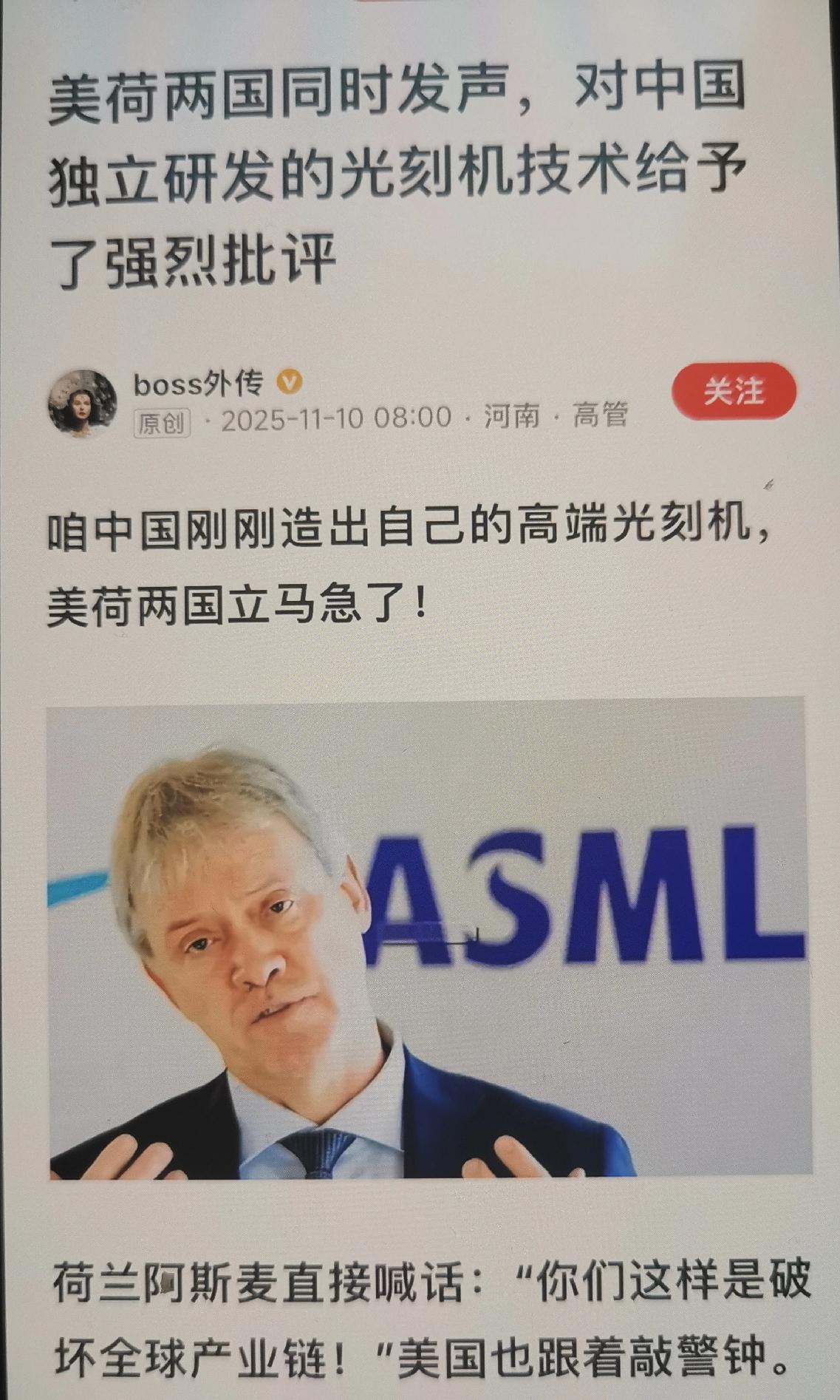 中国独立研发光刻机技术,被批评? 核心观点:美国,荷兰两国同时发声:“批评中国”,因为中国独立研发光刻机技术。这是多么不可理喻,而又多么蛮横不讲理。才会厚颜无耻的说出这样的话。 还在用“殖民者“,“统治者”的有色眼光,看待中国吗? 你的厚颜无耻,你的不可理喻,你的歇斯底里,你的蛮横无理都证明中国选择 — 独立自主,自力更生— 是不可改变的正确道路。
