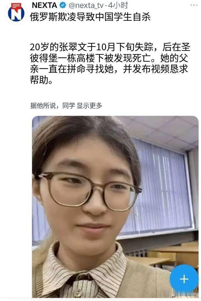 前两天刷到她爸满世界找闺女的视频,心里就咯噔一下,感觉凶多吉少。唉,真没想到等来这样的消息——圣彼得堡那个二十岁的中国留学生小姑娘张策雯,在穆里诺那儿被发现了,人没了。 说是从楼上掉下来的,具体咋回事警方还没定论。新闻里提过她可能因为俄语不好被同学嘲笑过,不过这说法还没得到官方确认。租的房子那儿灯还亮着,东西有点乱……听着就觉得揪心。 留学生在外头真不容易,安全永远是第一位的。希望这事能查个水落石出,给家人一个交代。