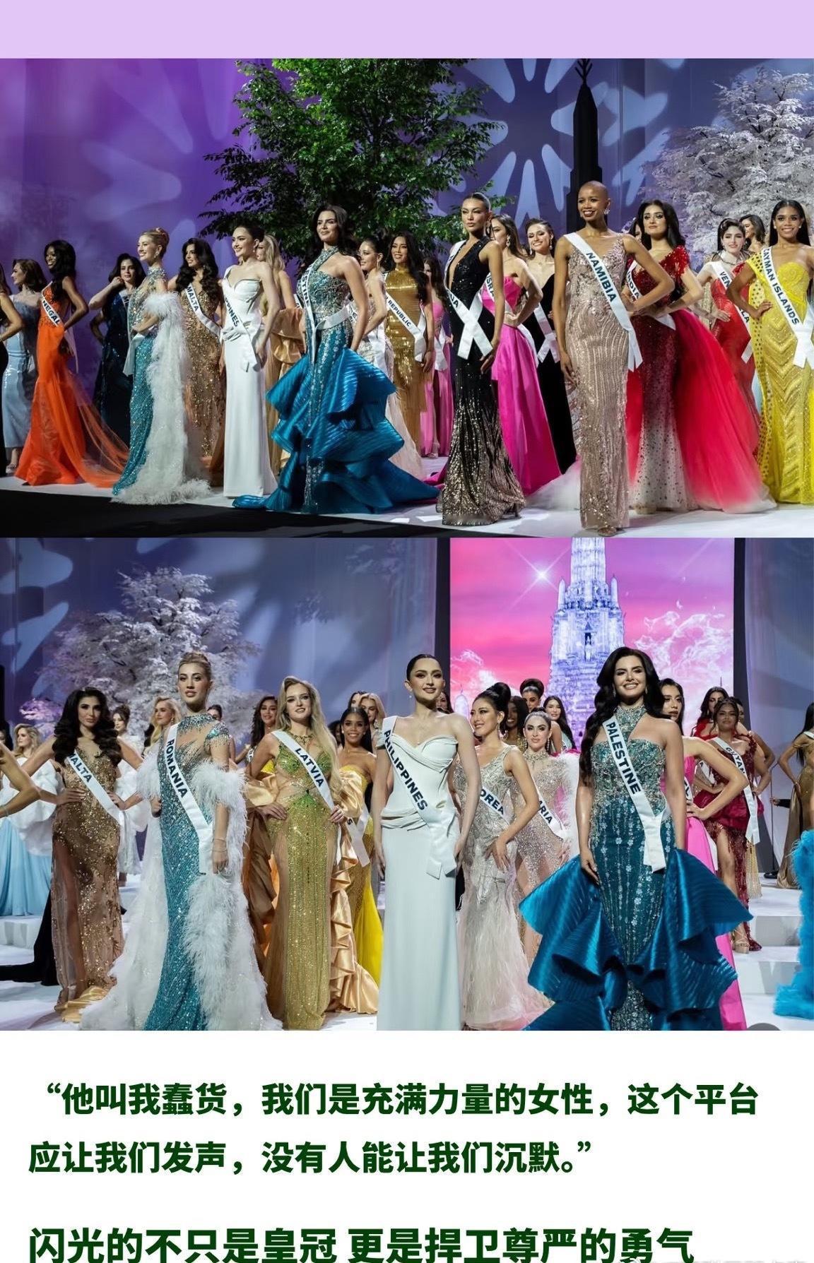 谁还没刷到2025环球小姐集体退赛的新闻?这波girls help girls简直燃到爆,看完直接浑身起鸡皮疙瘩! 原本11月21日要在泰国曼谷开赛,100多个国家的选手都早早到了备赛,结果一场全球直播的赛前绶带仪式,直接变成了对抗权力霸凌的名场面。主办方亚洲副总裁纳瓦特突然当众点名墨西哥小姐法蒂玛,就因为她没配合发布宣传视频,态度轻蔑到骨子里,反复打断人家解释,还嘶吼着“我没给你说话的机会”“愚蠢”,甚至叫保安过来赶人,台下当场一片“no”的抗议声。 可法蒂玛全程都没慌,说话又清晰又得体:“沟通有问题就解决沟通问题,你不能这么侮辱我,我代表的是我的国家!” 说完没等保安动手,拿起外套扭头就走,那叫一个潇洒。更让人震撼的是,其他选手瞬间被激怒,一个接一个起身跟着离场,任凭纳瓦特在后面扯着嗓子命令“坐下”,还威胁“离开就取消资格”,愣是没一个人回头。来自不同国家、不同肤色的姑娘们,本来是竞争冠军的对手,此刻却成了彼此最坚实的后盾,这波集体退赛直接把事件推上了热搜,第二天纳瓦特就扛不住压力,赶紧开了发布会公开道歉。 她们有骨气、有底线,更懂得团结起来对抗不公。纳瓦特仗着自己是主办方高管,就当众羞辱选手,说白了就是权力霸凌,觉得选手们为了冠军会忍气吞声。可他万万没想到,这些姑娘们把尊严看得比皇冠还重,一句“我代表我的国家”,不仅守住了自己的体面,更守住了国家的尊严,这不就是最棒的女性力量吗? 当不公发生时,她们没有想着“少一个对手更好”,而是毫不犹豫地站出来声援。离场后姑娘们聚在一起聚餐合唱的画面,真的又美又有力量,没有谁计较输赢,只有跨越国界的共情和支持。她们用退赛告诉全世界:选美舞台的意义从来不是被别人评判,而是展现自己的光芒,而尊严,是任何人都不能触碰的底线。美貌会过时,但骨子里的骨气和善良永远不会。