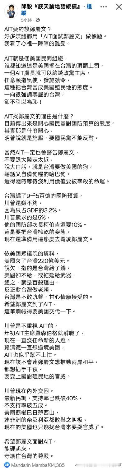 美国在台协会要求约谈郑丽文,简写名称为AIT的机构,一个隶属于美国的民间组织,哪里来的底气做出此种要求。 AIT,这个机构是在台湾面试,台湾人是否可以入境,的第一道关卡。 邱毅教授说川普上任之后对于AIT并不重视,但是一个民间组织可以决定台湾人是否能够入境美国,肯定是有背景。 而郑丽文一如既往的没有拒绝 这次约谈,可不是半民众面试能否入境美国这么简单 希望郑丽文能坚持立场,硬气些 台湾省郑丽文