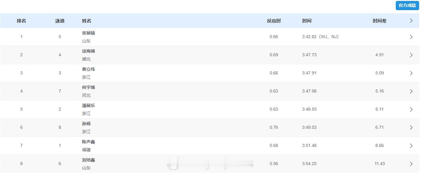 【全运会男子400自张展硕夺冠 潘展乐第五孙杨第六】全运会 潘展乐全运会400自第五孙杨全运会400米自由泳第611月10日深圳,全运会游泳男子400米自由泳比赛结束,山东选手张展硕以3分42秒82打破世界青年纪录并夺得冠军。湖北徐海博和浙江费立纬分获银铜牌。潘展乐和孙杨分获五六名,成绩分别为3分48秒93和3分49秒53。