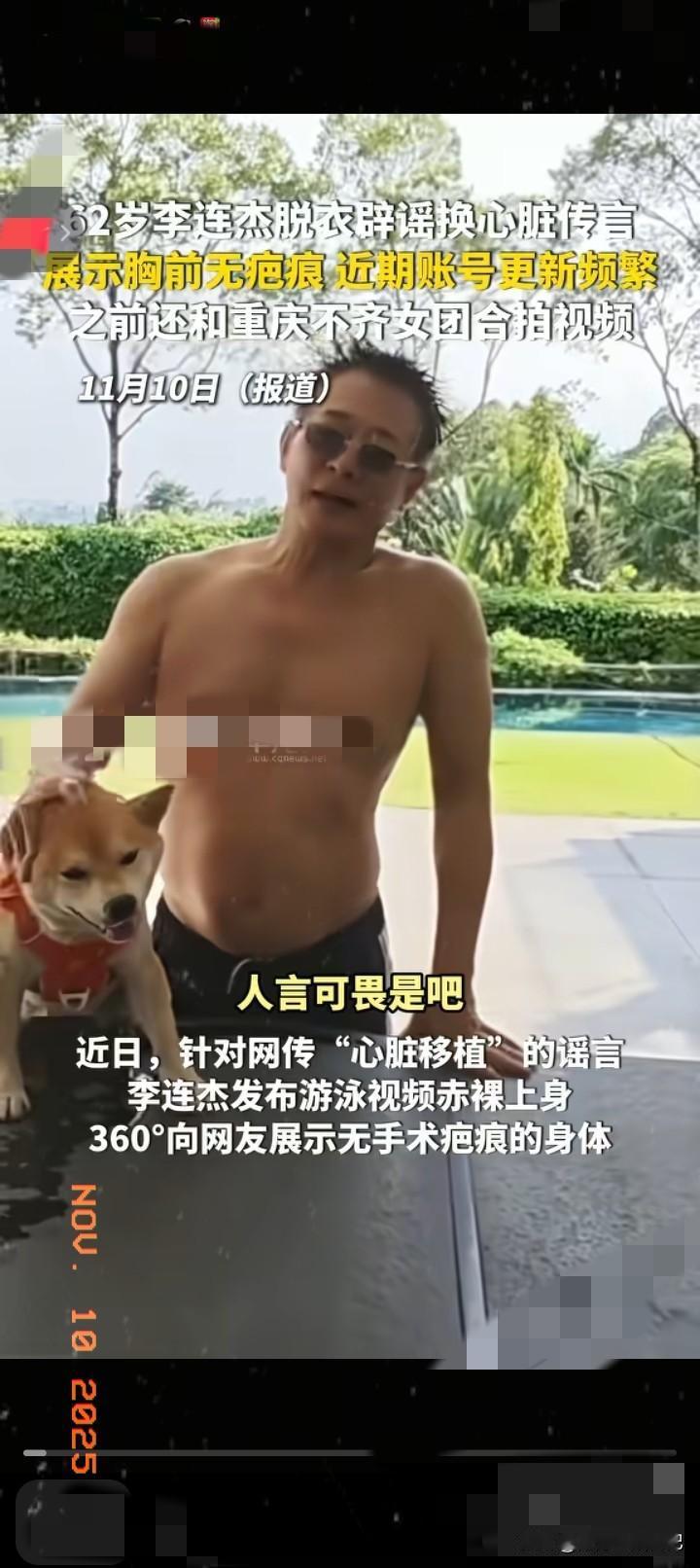 李连杰“换心脏”?别再被谣言牵着鼻子走! 最近又有人扯李连杰“换器官”“换心脏”,说得有鼻子有眼,可这纯属造谣! 人家早就亲自拍游泳视频辟谣了, 赤膊出镜把前胸后背都露得明明白白,连个手术疤痕都没有——要知道心脏移植得开胸,那Y形疤痕根本藏不住。 医学专家都出来说了,这就是最直接的反驳证据。 这些谣言说白了就是自媒体博眼球瞎编的!李连杰之前暂别公众、做个良性肿块切除手术,都能被炒作成“病危换心”,甚至编出器官来源的假故事。 主流媒体早就核实过,他团队也反复澄清,现在人家都正常参与公益了。 流量再香也不能编瞎话啊!你还见过哪些离谱的明星谣言?来评论区说说~