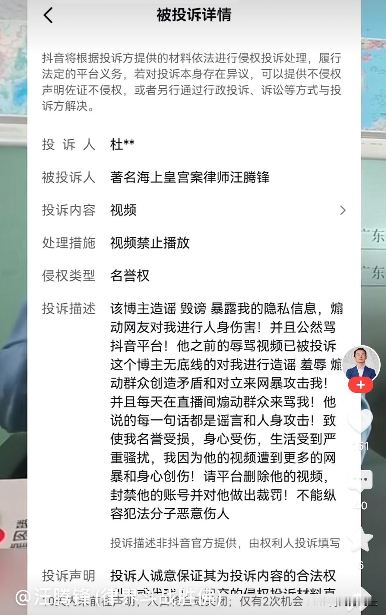杜星霖投诉多位自媒体人,她的诉求得到了平台的支持,相关视频已被下架,禁止播放。 这些被投诉的自媒体人发布的视频,被投诉的理由主要是涉及侵权,名誉权。 个别人的言论涉及造谣,诽谤,泄露隐私信息等。 杜星霖提出主张,请求平台下架相关视频。对于个别性质恶劣的发布者,请平台给予封号张纪中