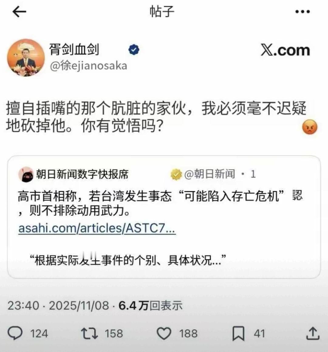 高市早苗“原形毕露”,上任日本首相,首先力挺“台独”。 人称“女版安倍”名副其实,强调“台湾有事,就是日本有事”。 “若台湾发生事态,可能陷入存亡危机,则不排除动用武力”。 64岁的她,想不到还是个好战分子。妥妥的安倍晋三复制版。 嚣张猖獗至极!🫢