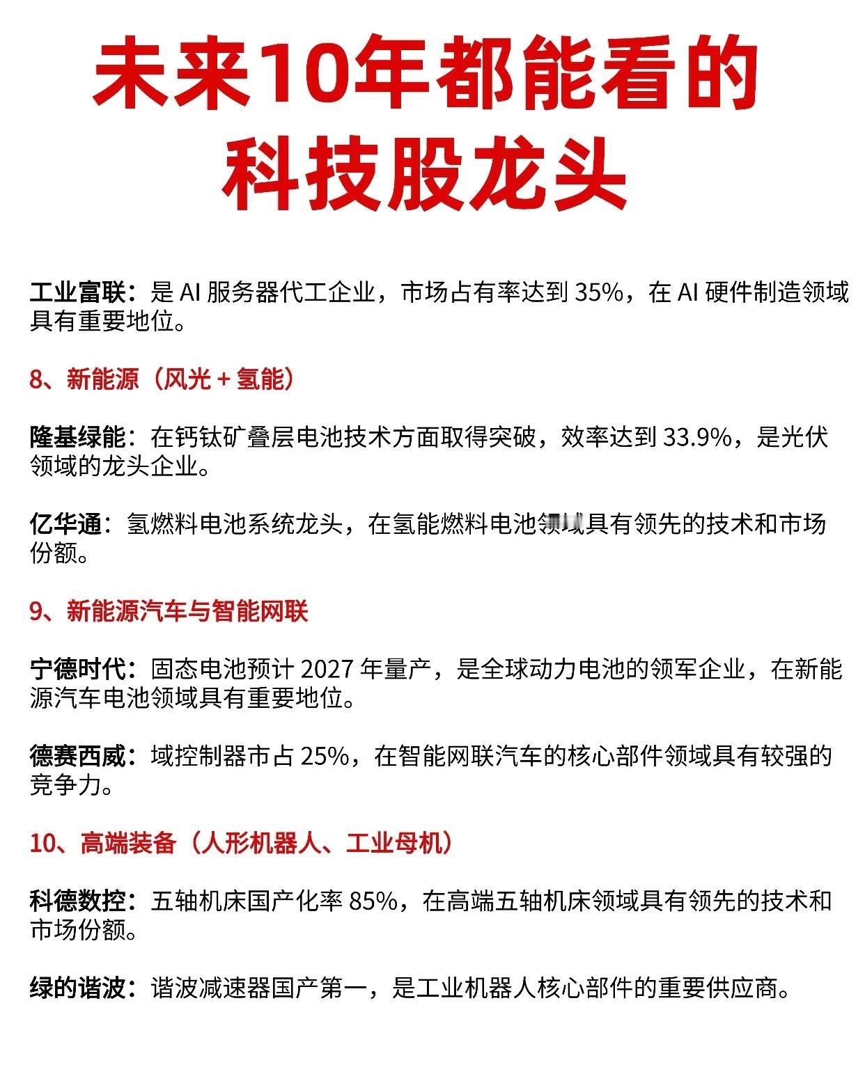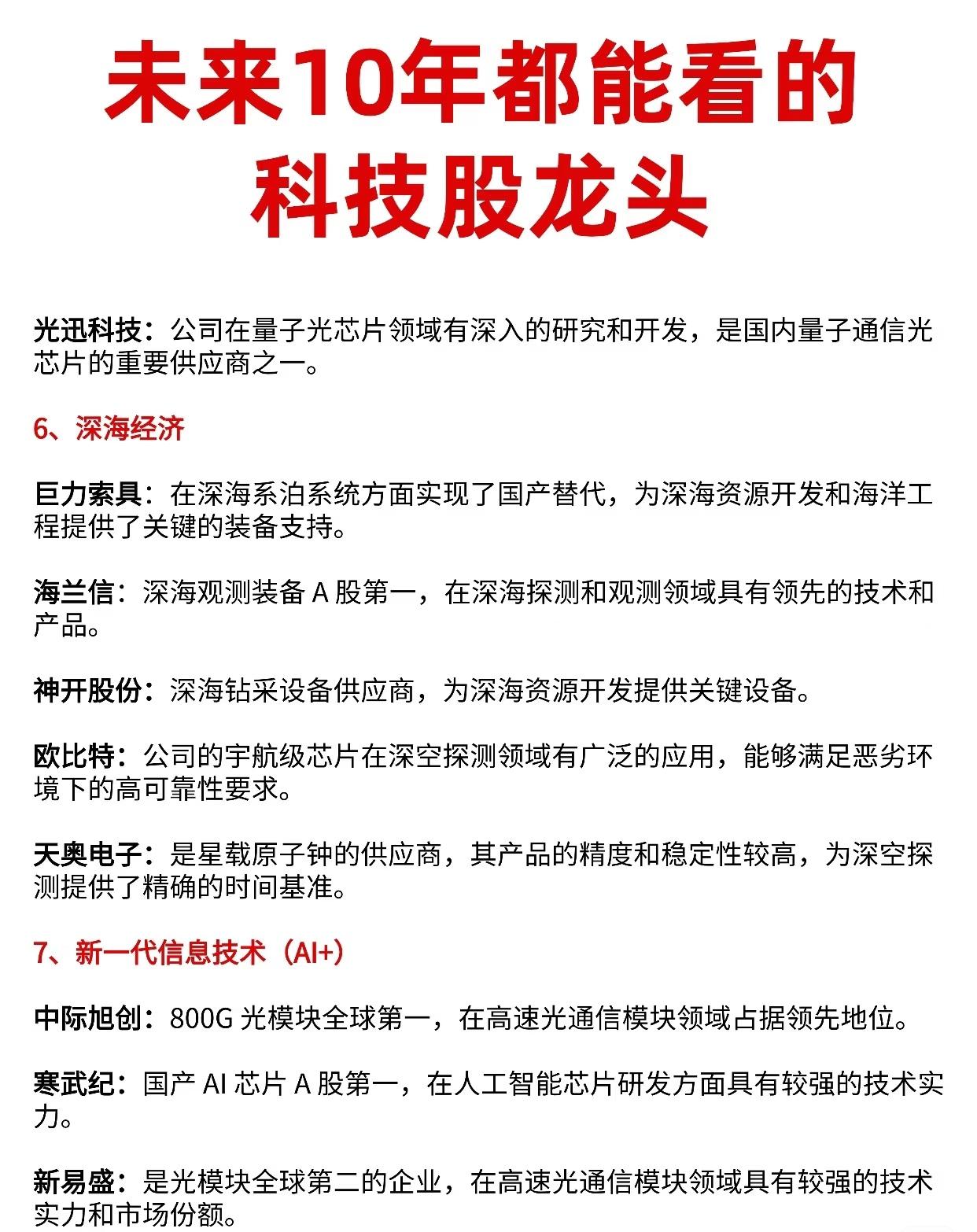 “未来10年值得关注的科技股龙头”综合分析报告,涵盖11个前沿科技方向,以及各领域内具有核心竞争力和行业地位的代表性上市公司,供您参考: 一、脑机接口(医疗与神经科技前沿) 1. 创新医疗:参股博灵40%,在脑机接口医疗应用领域有较强布局。 2. 岩山科技:专注非侵入式脑机接口技术,延迟仅60ms,技术优势显著。 3. 诚益通:同时布局侵入式与非侵入式脑机接口,技术路线较为全面。 4. 爱朋医疗:专注于脑电采集设备,在前端数据采集环节具备技术与市场优势。 👉 亮点:脑机接口是未来人机交互、医疗康复、神经疾病治疗的重要方向,技术壁垒高,商业化逐步推进。 二、可控核聚变(能源革命终极形态) 1. 中国核电:参股聚变公司,在产业布局中占据重要地位。 2. 旭光电子:ITER真空室唯一供应商,关键设备供应具有独特优势。 3. 融发核电:主管道供应商,为核聚变装置提供关键部件。 4. 中洲特材:提供X-750耐高温材料,产品技术领先。 👉 亮点:可控核聚变被视为人类未来清洁能源的终极解决方案,相关产业链正加速发展。 三、商业航天(太空经济新蓝海) 1. 中国卫星:卫星制造龙头,也是深空探测平台,影响力重大。 2. 上海瀚讯:G60载荷唯一供应商,为卫星通信业务提供关键支撑。 👉 亮点:低轨卫星、深空探测、商业发射等推动航天产业向民用和商用快速扩展。 四、人形机器人(智能制造与服务业的未来) 1. 禾川科技:伺服+控制器一体化,在核心控制与部件方面技术领先。 2. 埃斯顿:国产机器人龙头,制造经验丰富,技术积淀深厚。 3. 拓普集团:旋转执行器产品前景广阔,已与多家机器人企业合作。 4. 三花智控:关节总成供应商,产品精度与可靠性高,适配人形机器人高性能需求。 👉 亮点:人形机器人有望在未来进入家庭、医疗、服务等场景,是AI与机械结合的前沿代表。 五、量子信息(下一代通信与计算技术) 1. 国盾量子:量子通信核心设备供应商,国内领军企业。 2. 亨通光电:量子通信网络总包商,具备网络建设与运营能力。 👉 亮点:量子通信具备超高安全性,量子计算有望颠覆传统算力,是国家战略方向之一。 六、深海经济(海洋资源与国防战略) 1. 巨力索具:深海系泊系统实现国产替代,为海洋工程提供关键装备。 2. 海兰信:深海观测装备A股第一,技术与产品处于领先地位。 3. 神开股份:深海钻采设备供应商,服务资源开发。 4. 欧比特:宇航级芯片用于深空探测,适应极端环境。 5. 天奥电子:星载原子钟供应商,为深空任务提供高精度时间基准。 👉 亮点:海洋资源开发与国防安全并重,深海技术国产化是大趋势。 七、新一代信息技术(AI+高速通信) 1. 中际旭创:800G光模块全球第一,高速光通信领域领先。 2. 寒武纪:国产AI芯片A股第一,研发实力强。 3. 新易盛:光模块全球第二,市场与技术兼具。 👉 亮点:AI大模型、高速网络、边缘计算推动信息基础设施全面升级。 八、新能源(风光储氢协同发展) 1. 工业富联:AI服务器代工市占率35%,在AI硬件制造中地位关键。 2. 隆基绿能:钙钛矿叠层电池效率达33.9%,光伏技术全球领先。 3. 亿华通:氢燃料电池系统龙头,技术与市场双领先。 👉 亮点:新能源是碳中和核心,风光氢储协同发展,技术持续突破。 九、新能源汽车与智能网联 1. 宁德时代:固态电池预计2027年量产,动力电池全球领军者。 2. 德赛西威:域控制器市占率25%,在智能网联核心部件领域竞争力强。 👉 亮点:智能电动车是未来交通与能源消费的核心载体,智能化与电动化不可逆转。 十、高端装备(精密制造基石) 1. 科德数控:五轴机床国产化率达85%,高端制造领域技术领先。 2. 绿的谐波:谐波减速器国产第一,是工业机器人核心零部件供应商。 👉 亮点:高端装备制造是工业母机与智能制造的基础,国产替代空间广阔。 十一、民用核技术(核能应用拓展) 1. 中国核电:玲龙一号小堆首堆计划2026年投运,小型堆领域领先。 2. 中广核技:伽马刀用钴-60实现国产替代,在放射性同位素应用中作用关键。 👉 亮点:除发电外,核技术在医疗、工业检测、农业等领域也有广泛应用前景。 总结建议: 这些科技方向覆盖了人工智能、能源革命、航天探索、生物交叉、高端制造、深海开发、量子科技等国家战略性新兴领域,相关龙头企业在技术研发、市场占有率、供应链地位等方面具备先发优势,是未来10年科技创新与产业变革的重要参与者。
