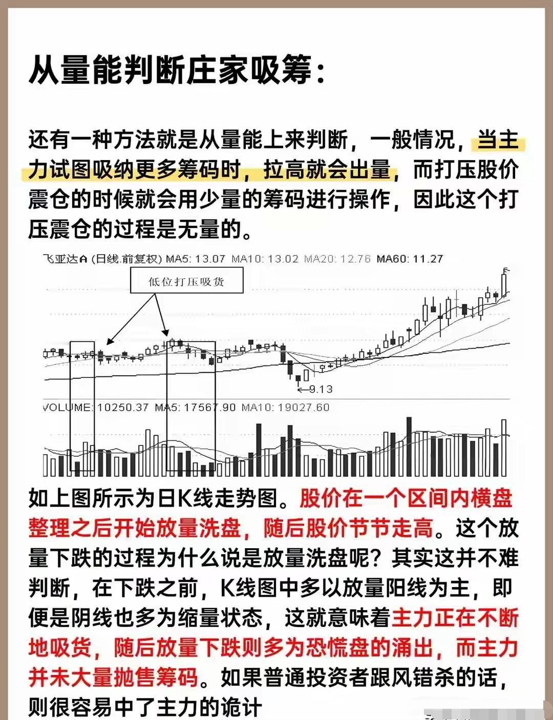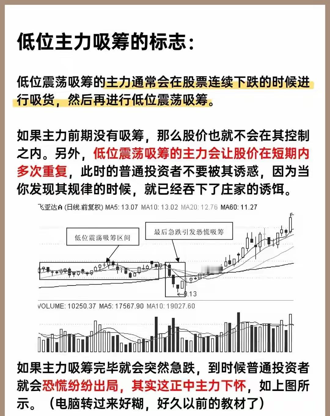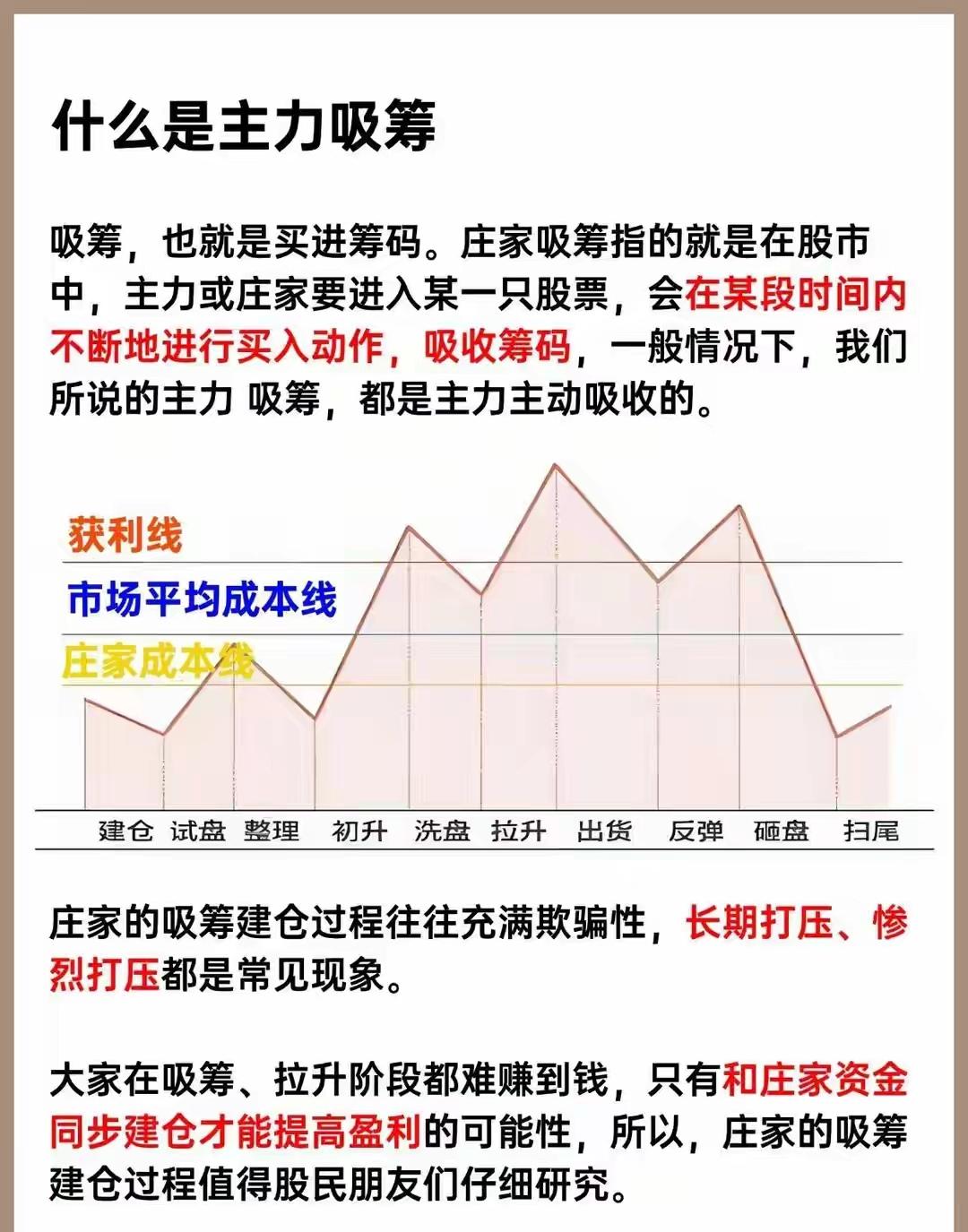 主力吸筹核心要点总结 1. 什么是主力吸筹? - 主力(庄家)主动在一段时间内持续买入股票,吸收筹码,为后续拉升做准备。 2. 主力吸筹的典型阶段(见图1阶段流程):建仓 → 试盘 → 整理 → 洗盘 → 拉升 → 出货(其他如反弹、砸盘、扫尾为辅助阶段)。 3. 如何识别主力吸筹? - 看成交量:吸筹时放量(资金进场),洗盘时可能缩量(清洗浮筹)。 - 看股价表现: - 低位震荡吸筹:股价长期低位徘徊,反复波动(如图3,避免被短期波动迷惑)。 - 急跌洗盘:主力吸筹完毕后突然砸盘制造恐慌,逼散户割肉(如图3“最后急跌”)。 - 看均线与量能(如图4-5): - 拉高放量(主力吃货)、打压缩量(震仓洗盘)。 - 突破信号:5日均线向上穿越其他均线 + 放量阳线站稳,预示拉升开始(如图5)。 4. 主力吸筹的陷阱与应对 - 欺骗性:主力可能长期打压股价,制造弱势假象,需观察庄家成本线(图1黄色线)与市场平均成本(蓝色线)的关系。 - 关键策略:在吸筹和拉升阶段与庄家同步建仓,盈利概率更高(图2)。 总结:主力吸筹是悄悄收集筹码的过程,通过量价关系(放量/缩量)、股价波动(低位震荡/急跌洗盘)、均线突破信号可识别。避免在恐慌中卖飞,学会观察主力动向。