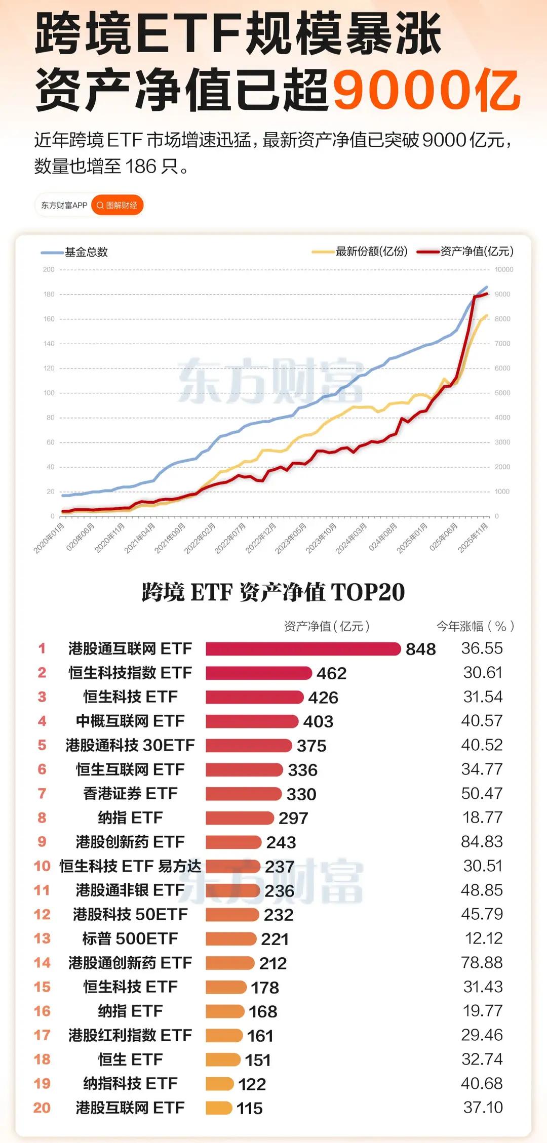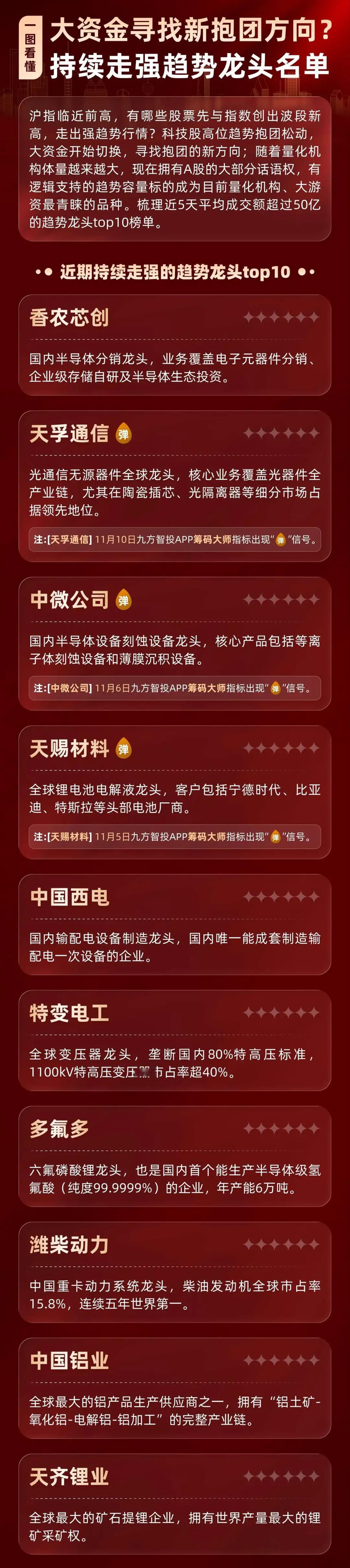 当前市场热点主要集中在以下几个方向,涵盖消费、新能源、科技、跨境投资以及前沿科技等领域,以下是核心要点的提炼总结: 一、大消费板块集体爆发(11月10日) - 驱动因素:政策利好 + 基本面积极信号。 - 市场表现:大消费多个细分领域个股掀起涨停潮,如中国中免、首旅酒店、舍得酒业等。 - 涉及细分领域及代表企业: - 奶粉/乳业:三元股份、庄园牧场、新乳业等; - 旅游酒店:首旅酒店、锦江酒店、君亭酒店、大连圣亚等; - 酿酒行业:舍得酒业、酒鬼酒、泸州老窖、古井贡酒等; - 民航:中国东航、中国国航、春秋航空等; - 美容护理:拉芳家化、爱美客、稳健医疗等; - 休闲食品:好想你、来伊份等; - 儿童玩具、宠物经济、社区团购、商业百货、免税、微信小店等相关概念企业也有亮眼表现,如中宠股份、佩蒂股份、家家悦、王府井、中国中免等。 👉 总结:消费板块在政策刺激与市场情绪推动下迎来全面回暖,多股涨停,覆盖衣食住行娱多维度内需赛道。 二、储能板块持续走强 - 驱动因素:国内风光发电快速发展 + 海外需求强劲。 - 细分领域及代表企业: - PCS & 大储集成:阳光电源、禾望电气、科士达; - 电池:宁德时代、比亚迪、亿纬锂能; - 算力电力协同:中恒电气、蔚蓝锂芯; - 储能EPC:南网科技、中国能建; - 就近消纳方向:国电南瑞、国能日新。 👉 总结:储能作为新能源重要基础设施,受益于国内外能源结构转型,相关产业链持续受到资金关注。 三、趋势龙头Top10:大资金新抱团方向 - 市场背景:沪指接近前期高点,科技股高位趋势抱团出现松动,大资金寻找新的趋势性容量标的。 - 筛选标准:近5天平均成交额超50亿的趋势龙头。 - 代表企业及其亮点: 1. 香农芯创:国内半导体分销龙头,覆盖存储与生态投资; 2. 天孚通信(11月10日出现“弹”信号):光通信无源器件全球龙头; 3. 中微公司(11月6日“弹”信号):半导体刻蚀设备龙头; 4. 天赐材料(11月5日“弹”信号):全球锂电池电解液龙头,客户包括宁德时代、特斯拉; 5. 中国西电:国内唯一全套输配电一次设备制造龙头; 6. 特变电工:全球变压器龙头,1100kV特高压市占率超40%; 7. 多氟多:六氟磷酸锂龙头,国内首家量产半导体级氢氟酸; 8. 潍柴动力:中国重卡动力系统龙头,全球柴油机市占率15.8%,连续五年第一; 9. 中国铝业:全球最大铝产品供应商,拥有完整铝产业链; 10. 天齐锂业:全球最大矿石提锂企业,拥有世界级锂矿资源。 👉 总结:大资金正从高位科技股向具备硬逻辑的趋势性龙头切换,聚焦半导体、新能源、高端制造、资源等核心赛道。 四、跨境ETF规模爆发式增长(资产净值已超9000亿) - 市场现状:跨境ETF总规模突破9000亿元,数量达到186只,近年增速迅猛。 - 资金流向TOP20跨境ETF(部分代表性产品): 1. 港股通互联网ETF:资产净值848亿元,今年涨幅36.55%(第一名); 2. 恒生科技指数ETF / 恒生科技ETF:规模462亿/426亿,涨幅约30%-31%; 3. 中概互联网ETF:403亿,涨幅40.57%; 4. 港股通科技30ETF、恒生互联网ETF、香港证券ETF等均超300亿,涨幅在30%-50%+; 👉 总结:资金持续南下+布局海外,跨境ETF成为配置全球资产的重要工具,港股互联网、科技、医药等方向最受青睐。 五、太空算力:前沿科技新方向初现 - 背景:太空成为算力布局新疆域,多家上市公司加速布局航天级算力基础设施与技术。 - 代表企业及业务亮点: - 乾照光电:航天级太阳能电池板研发进度A股领先,高转换效率+抗辐射; - 上海港湾:前瞻布局航天级钙钛矿太阳能电池,理论效率超30%(远超传统晶硅电池25%); - 四川金顶:旗下“开物星空”自主研发超算芯片“开物神算”,在太空算力运营与芯片领域双领先; - 普天科技:卫星通信载荷与信关站核心供应商,正在研发微波激光一体化星载系统; - 顺灏股份:参投北京轨道辰光,布局计算卫星赛道,首发试验星计划2025年底发射; - 中科星图:数字地球龙头,深入论证太空算力星座,中科院背景支持; - 合众思壮:北斗高精度技术龙头,技术延伸至卫星应用; - 上海沪工:设立卫星业务平台,服务商业卫星配套。 👉 总结:太空算力作为前沿科技和高端制造交叉领域,正吸引多家上市公司提前战略布局,未来有望成为航天+AI+算力的新兴融合方向。