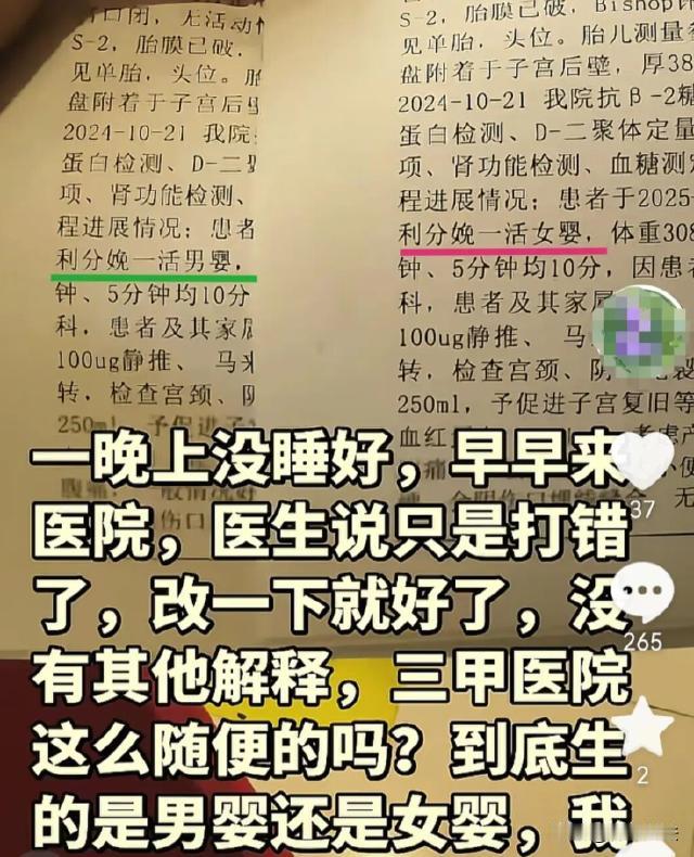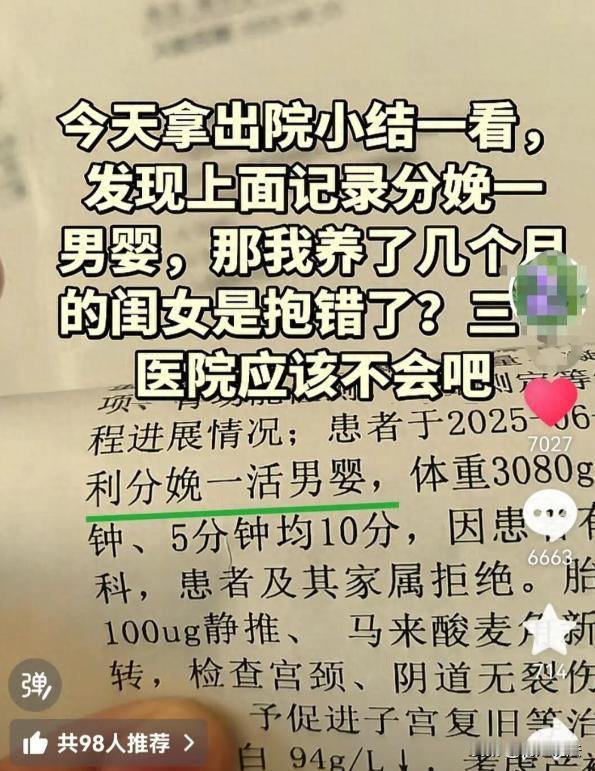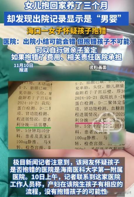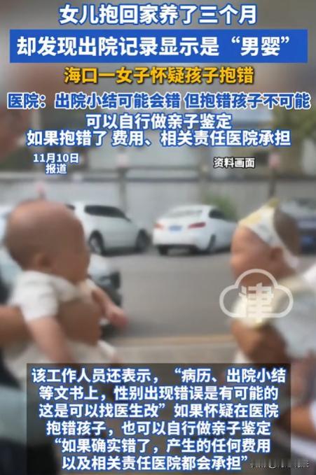 海南海口,一网友称她女儿都三个月大了,结果翻看生孩子时的出院记录,上面竟写着分娩一活男婴。养了三个月的闺女,难道抱错了?她发视频求助,网友纷纷建议做亲子鉴定。 11月10日上午,该网友再次发视频,说她一晚上都没睡好,心里全是出院记录上那句“分娩一活男婴”。 早上天还没亮,她就匆匆赶到医院,她又急又怕,急的是想赶紧弄清楚真相,怕的是自己养了三个月的孩子真不是亲生的,该怎么办。 医生看了出院记录后说,就是打错了,改下就行,没做其他解释。 可她一听这话,整个人都懵了,心里头忍不住犯嘀咕:这事可不算小,怎么连自己亲生的娃是男是女都搞不清楚呢? 原来,她生孩子那天,有两个人同时生孩子,另一人回产房说生了男孩,她当时没在意,现在越想越不对劲。 她开始回忆,生产那天结束之后,医护人员有没有在第一时间把孩子的性别告诉她呢?好像并没有明确说明,只是让她匆匆瞧了孩子一眼。 她陷入了迷茫的困扰,就只好在网上发起了求助的视频,视频中她就一一的将出院的相关的记录都给展示了,还将那些令她莫名其妙的文字都给标注了出来。 视频一发出,有网友说,赶紧做亲子鉴定吧,别耽误了。有的说,肯定有问题,需要尽快弄清楚。 记者看到视频后,联系了医院,医院的工作人员说,生孩子有固定流程,不会抱错孩子的。 工作人员解释,生产后医护人员会第一时间告知婴儿性别,还会让产妇确认婴儿特征,比如有没有胎记之类的。 不过,出院小结等文书上性别出现错误是有可能的,这种情况可以找医生修改,医院有修改病历的流程。 工作人员还说,若有人对在医院是否抱错孩子有疑问,可自行做亲子鉴定,若确实出错,产生的任何费用以及相关责任,医院都会承担。 该网友听了医院的话,心里还是七上八下的,她不知道该不该相信他们说的,也不知该不该去做亲子鉴定。 有人认为,医院记录出错,导致网友产生误解,医院应该承担责任。 根据《民法典》规定,行为人因过错侵害他人民事权益造成损害的,应当承担侵权责任。 医院作为专业医疗机构,有义务确保病历记录的准确性,这次记录出错,虽然可能是无心之失,但还是给网友带来了精神损害,应该承担相应的赔偿责任。 不过,这并不意味着就一定抱错了孩子,有严格的生孩子流程,医护人员会第一时间告知婴儿性别,还会让产妇确认婴儿特征。 如果医院能证明自己按照流程操作,没有过错,那么就不应该承担抱错孩子的责任,抱错孩子和记录出错是两码事。 有人问,如果网友去做亲子鉴定,结果发现孩子真不是自己的,医院该承担什么责任? 根据《民法典》规定,医疗机构及其医务人员因过错造成患者损害的,应当承担赔偿责任。 如果亲子鉴定结果证明医院抱错了孩子,那么,医院就应该承担因抱错孩子给网友带来的所有损失,包括精神损害赔偿、抚养费用等。 当然,如果亲子鉴定结果证明孩子是网友自己的,那么网友就应该承担鉴定费用,并不能因此追究医院的其他责任,亲子鉴定是网友主动要求,用于确认亲子关系。 也有人说,网友不应该轻易相信医院的话,应该坚持做亲子鉴定,这种想法有一定道理,毕竟亲子鉴定是最直接、最有效的证明方式。 不过,亲子鉴定的前提就要权衡带来的经济和心理的风险了。 如果具备相对比较好的经济基础,又能承受可能带来的那一份心理压力和鉴定所需的费用,那么就不妨做个亲子鉴定。 目前,医院工作人员表示,产妇在医院生孩子有固定流程,不存在抱错孩子的可能,文书上性别出现错误是有可能的,这种情况可以找医生修改。 若对是否抱错孩子有疑问,可自行做亲子鉴定,若确实出错,产生的任何费用以及相关责任医院都会承担。 从法律看,记录出错和抱错责任不同,需分情况判断,希望能更严谨,避免类似误会。