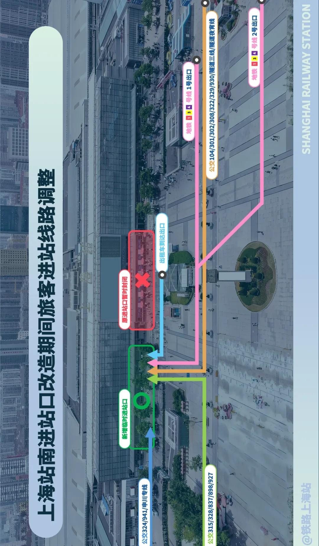 【明起上海站南广场改造施工,请提前出行~】@铁路上海站 介绍,11月11日,上海站南进站口升级改造工程全面启动,此次施工预计持续至2026年1月底,升级改造后,旅客出行体验将进一步改善(详见链接:微博正文)。改造期间,临时进站口较原进站口进站需多步行5-10分钟,请预留充足时间。施工期间,请尽量从北进站口进站。详见↓