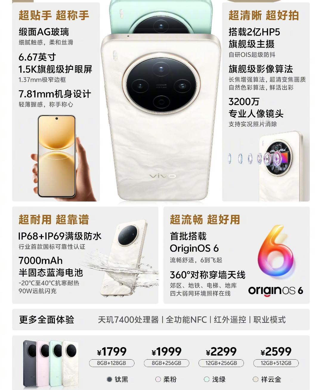 1799元起,vivo Y500Pro发布,搭载天玑7400处理器 8+128GB:1799元 8+256GB:1999元 12+256GB:2299元 12+512GB:2599元 核心参数如下: ---天玑7400处理器、LPDDR4X内存、UFS2.2闪存 ---6.67英寸OLED直屏、1.5K分辨率、120Hz刷新率、3840Hz 高频PWM调光、全局峰值亮度1600nits ---200MP主摄(HP5,1/1.56",OIS)+2MP景深,前置32MP ---90W有线充电+7000mAh电池,厚7.81mm、重198克 ---支持NFC和红外遥控,IP68&IP69,塑料中框+玻璃后盖,转子马达、单扬声器,双频GPS/北斗、USB2.0 两千多的手机还是单扬声器,塑料中框,转子马达。