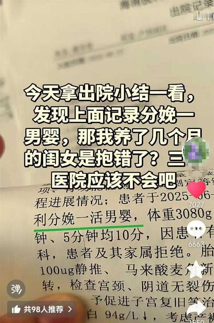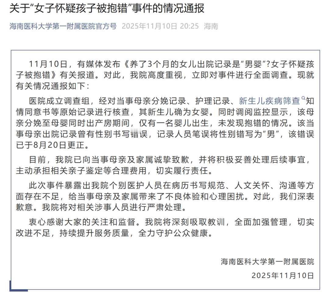 【医院出院记录性别写错,妈妈怀疑“抱错孩子”,官方急查结果来了!】 11月10日,海南一位妈妈发视频爆料:自己养了三个月的女儿,最近突然翻出医院出院小结,发现上面记载的是“分娩一活男婴”,顿时疑云升起——难道自己抱错了孩子?网友纷纷建议去做亲子鉴定,“谁都怕这事摊上自己!” 事件曝光后,海南医科大学第一附属医院当晚发布情况通报回应。院方表示,已迅速成立调查组,仔细核查了分娩记录、护理记录、新生儿筛查等原始资料,监控也调出来了,都能确认该妈妈分娩的确实是女婴,出产房到回病房期间没有任何婴儿被更换的情况。所谓“男婴”其实只是记录人员的一次笔误,性别早在8月20日就已经更正。 医院火速致歉,承诺将主动承担相关亲子鉴定费用,妥善处理好后续,绝不推卸责任。同时也“痛批”了涉事医护在病历书写、人文关怀等方面的疏忽,给家属造成了心理压力,将严肃处理相关人员,并以此为戒、全面整改。 此次事件提醒大家:医院文件有误虽罕见,但一纸之差确实可能让人精神紧绷。如果遇到类似情况,及时沟通、核查十分重要。最后,安全感不是空口承诺,唯有每个环节都认真对待,才能守住每一份信任。