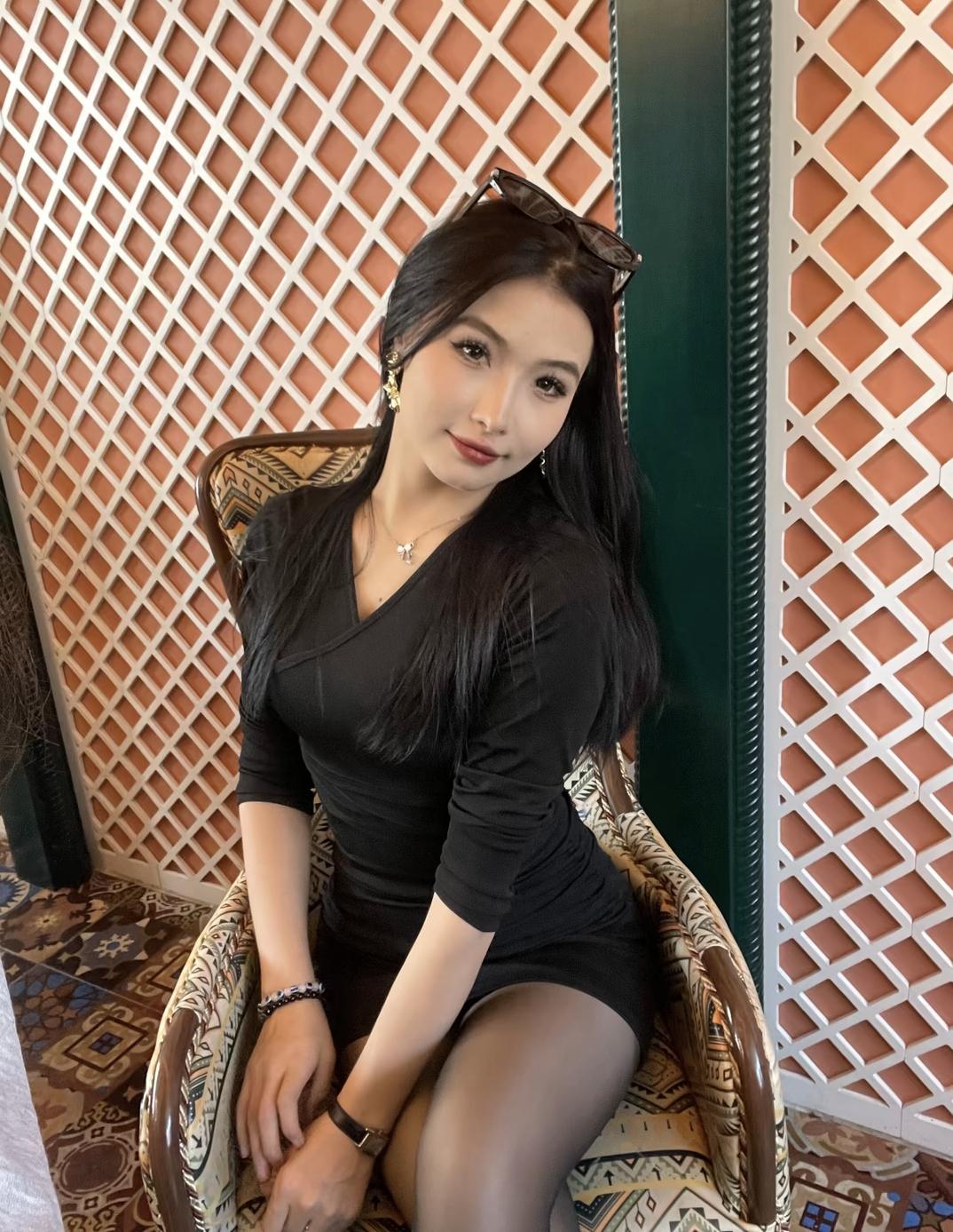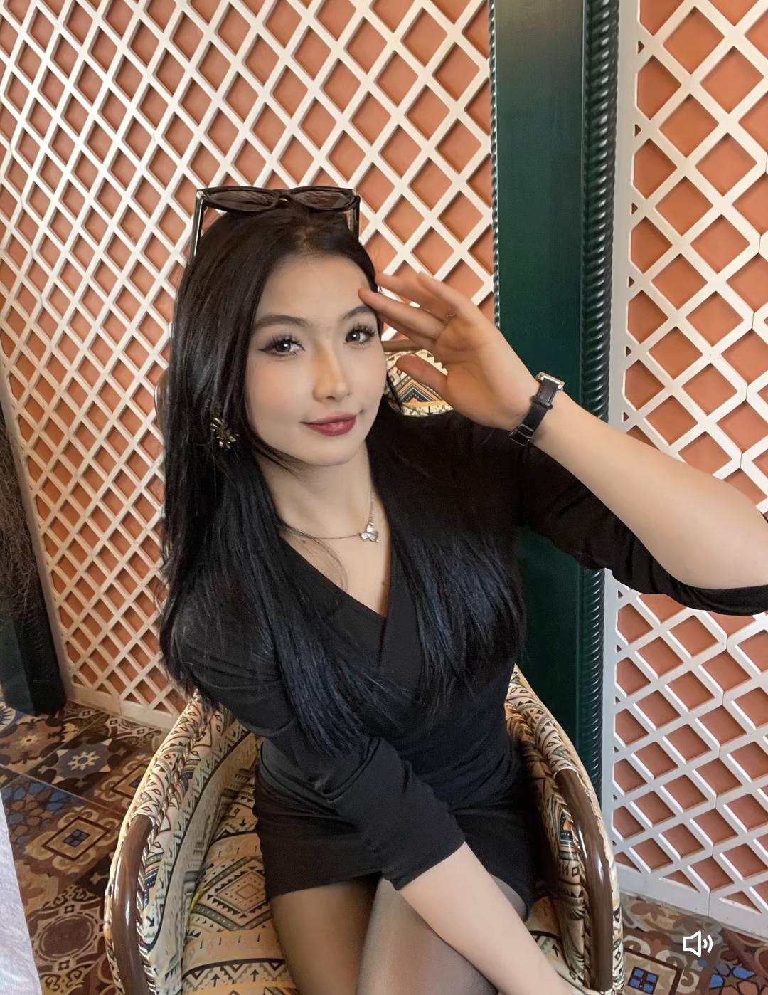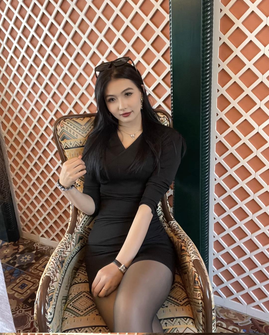 优雅黑裙,复古椅背,时尚眼镜,精致妆容,自信微笑。